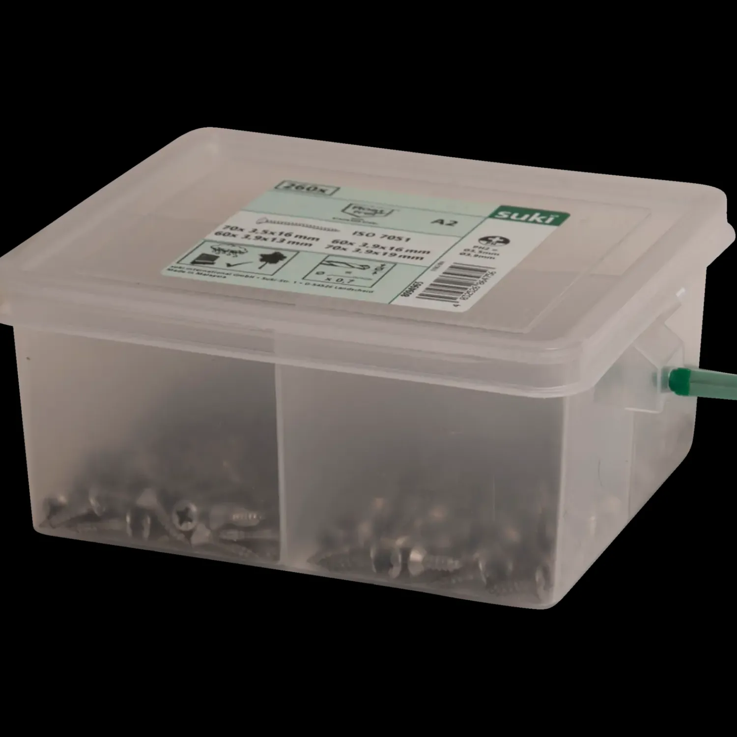 260 stk. assorterede rustfrie skruer linsehovedet og PH2 kærv. Standard ISO 7051. Disse skruer er særligt gode til udendørs brug.
