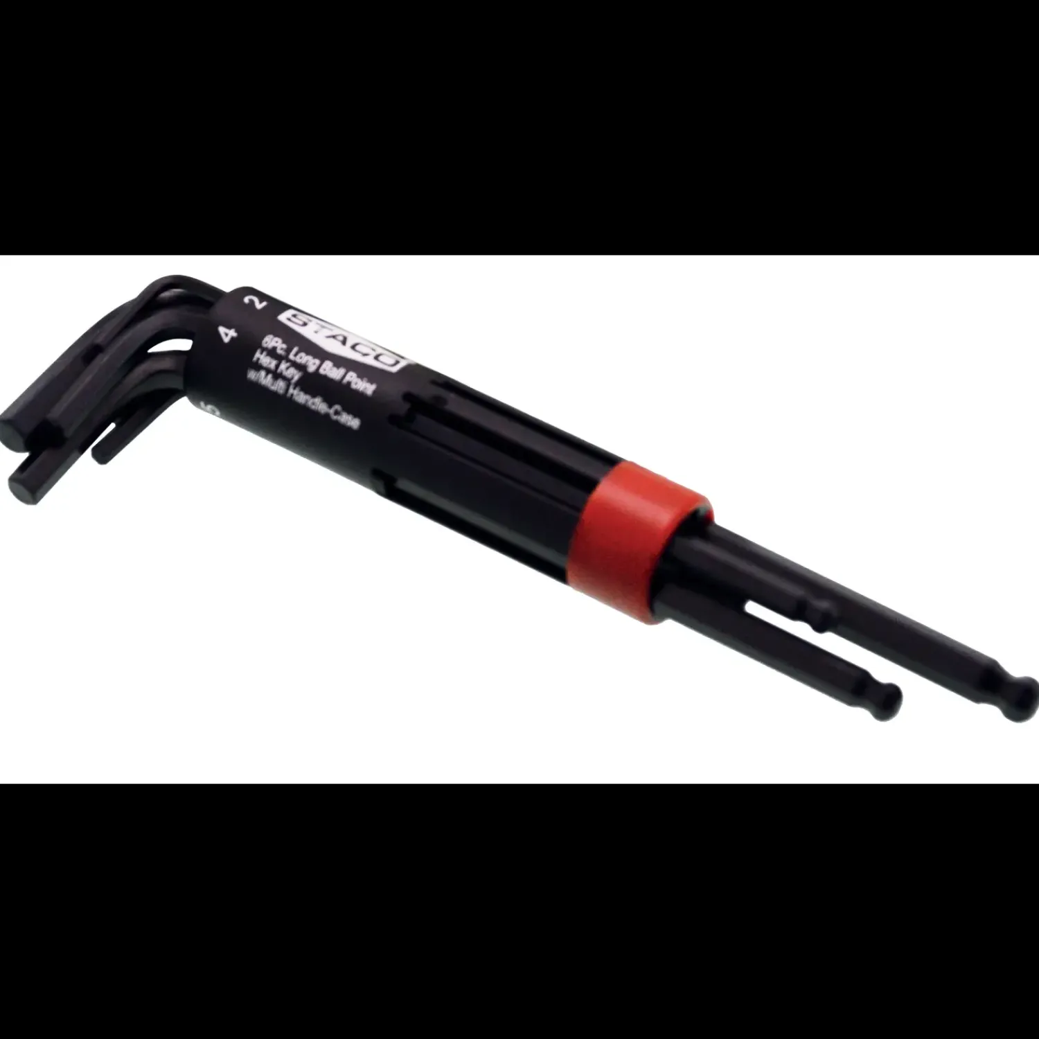 Stærkt stiftnøglesæt fra Staco med 6 nøgler i rund holder, alle nøgler er med kugle for fleksibel anvendelse.