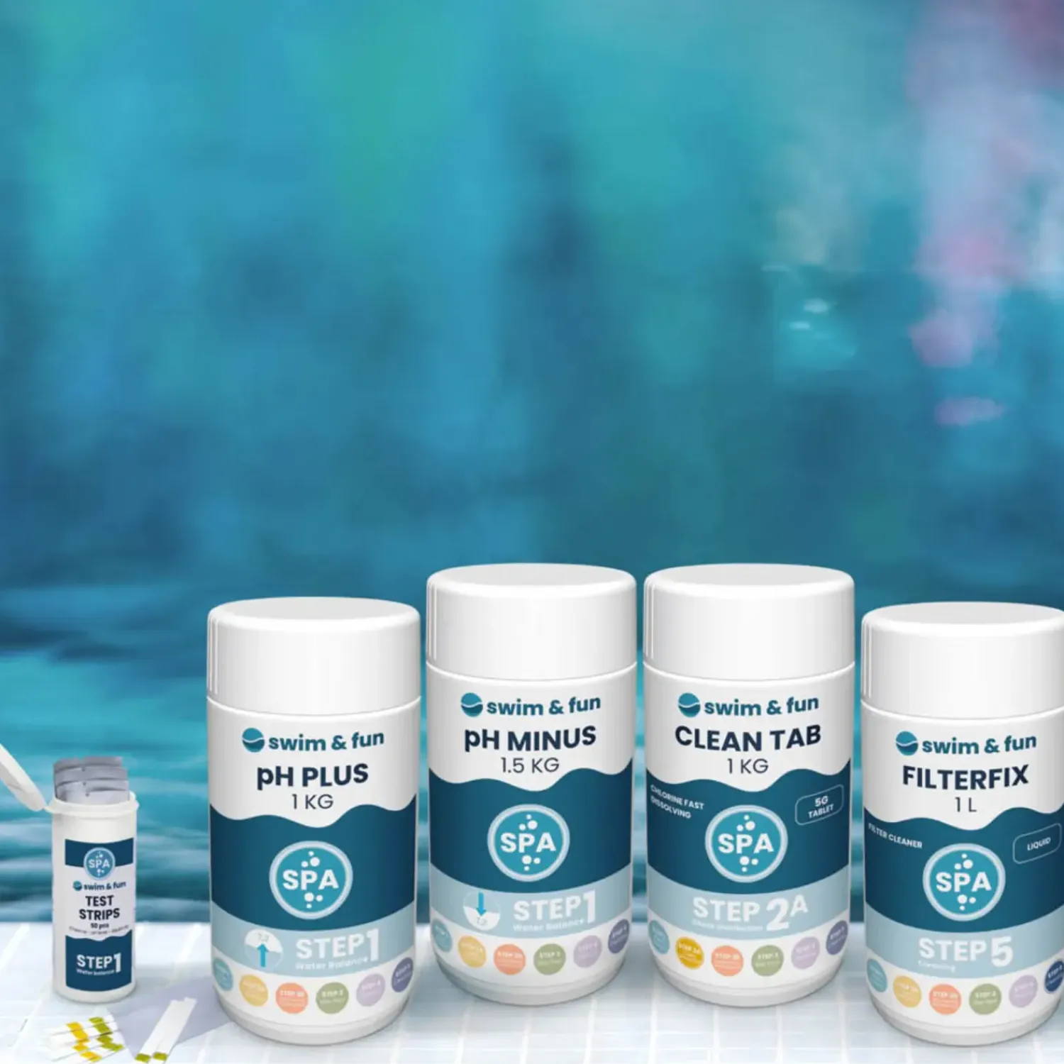 Sættet indeholder alle de plejemidler, der er nødvendige for at holde vandet i spabadet rent.