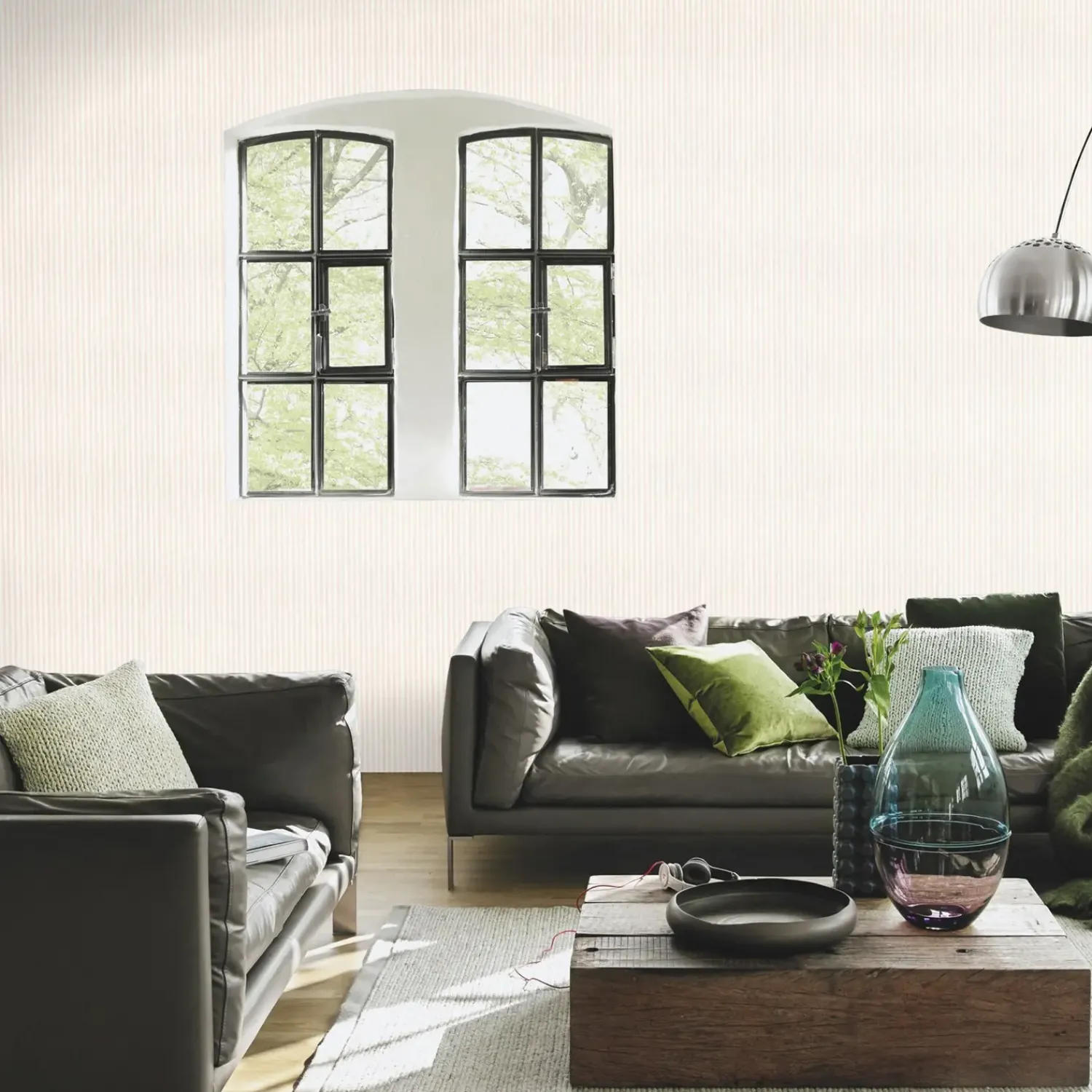Et stribet tapet med brede striber, der giver enkle, nordiske og behagelige nuancer, der kan passe til både en traditionel og moderne indretning. Perfekt til både børneværelset, gangen, stuen og soveværelset. Skab en badehotelsstemning med tapetet.