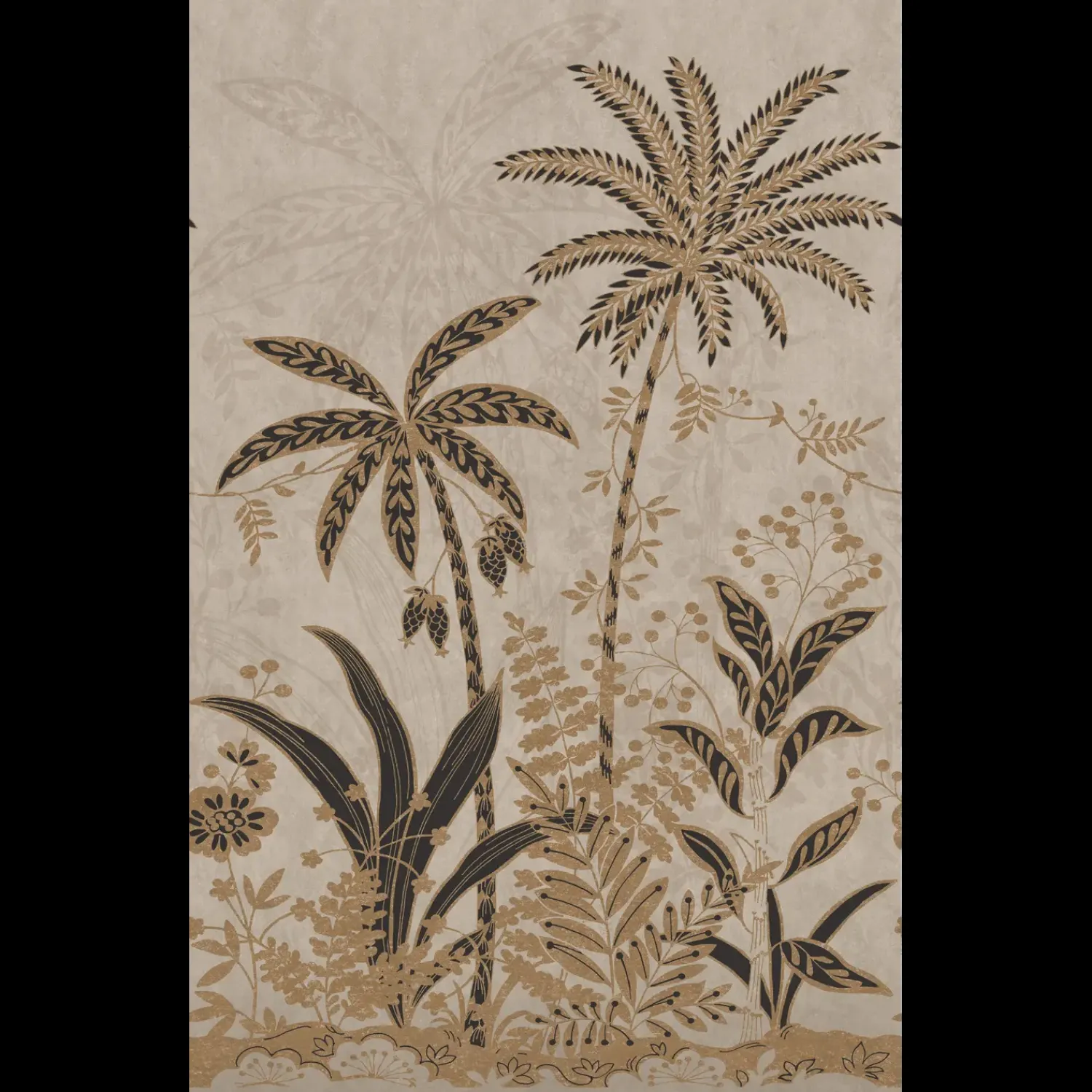 Et stormønstret palmetapet med store, kraftige palmeblade i forgrunden, og mere afdæmpede blade i baggrunden. De forskellige lag i mønstret skaber en imponerende dybde på tapetets overflade.