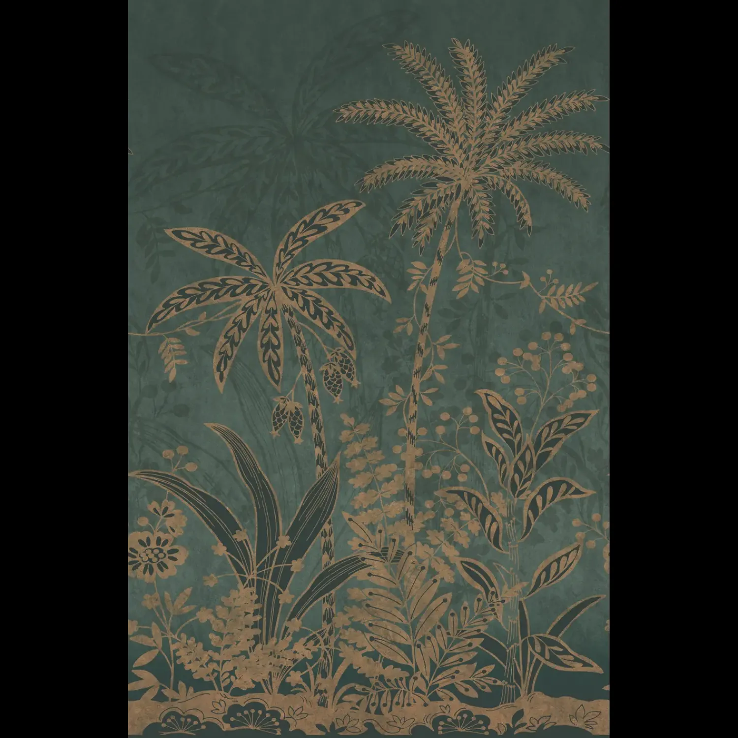 Et stormønstret palmetapet med store, kraftige palmeblade i forgrunden, og mere afdæmpede blade i baggrunden. De forskellige lag i mønstret skaber en imponerende dybde på tapetets overflade.