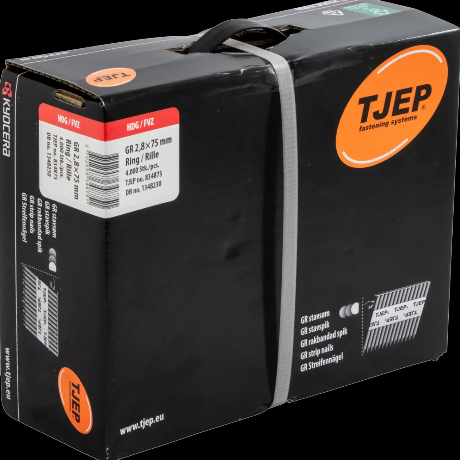 TJEP GR 28/75 ringsøm jumboboxAntal: 4.000 stk.Form: RingsømOverflade: VarmgalvaniseretHoved: D-hoved Vinkel: 34°Dia…