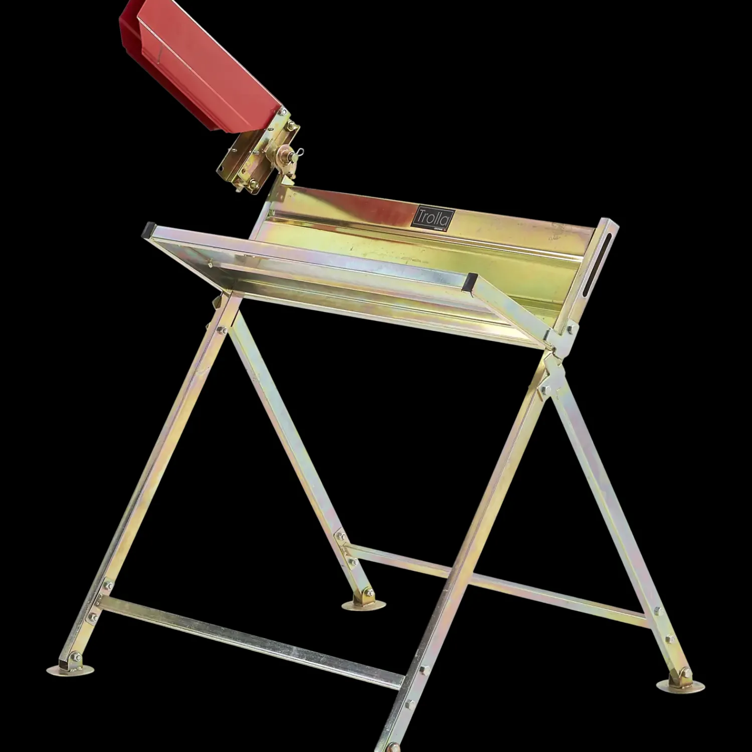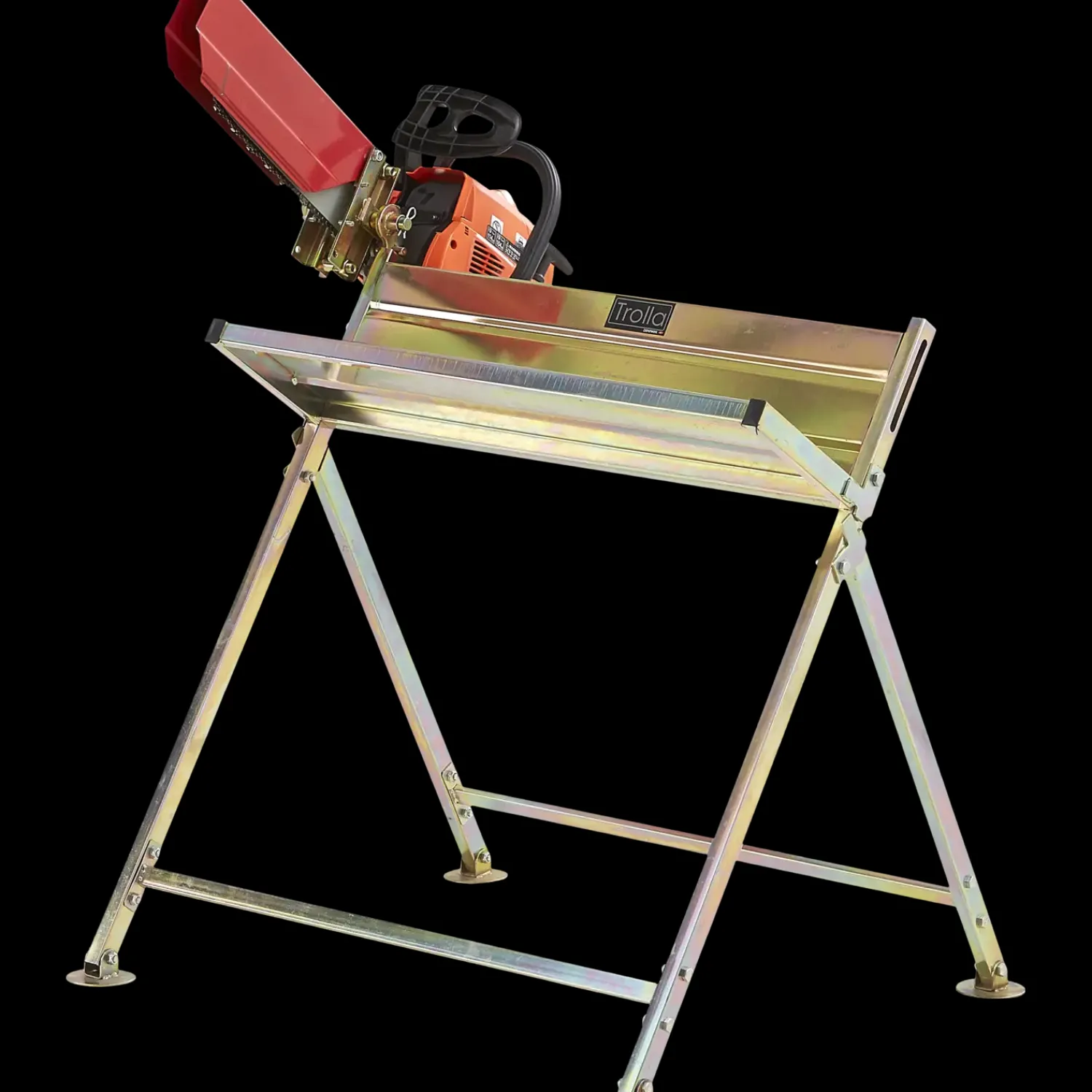 Trolla savbuk til afkortning af brændestykker, her er motorsaven fastmonteret til den robuste metal buk. hvilket betyder at motorsaven og det beskyttende skjold blot skal vippes op og ned, dette giver en langt sikre arbejdsgang samt langt mindre løft på saven.
