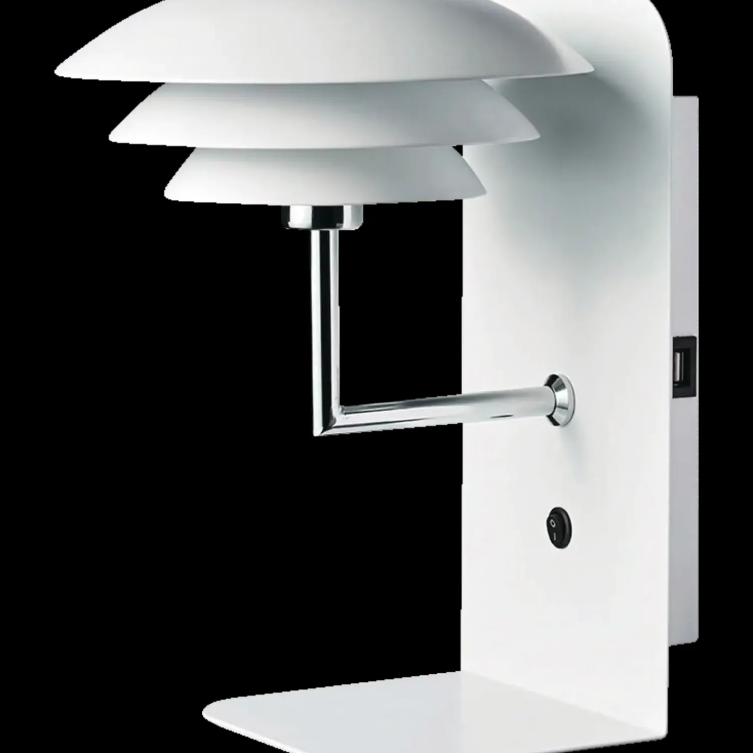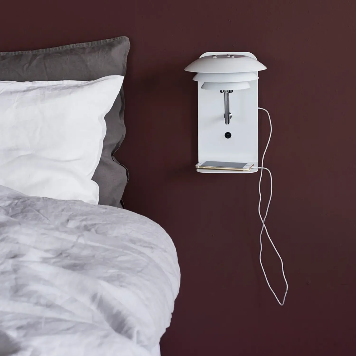 DL20 væglampen fra Dyberg Larsen har en indbygget hylde og USB udtag. Placer den ved din ynglingsstol eller brug den i soveværelset som natbord med mulighed for at tilsluttet din oplader til telefonen.