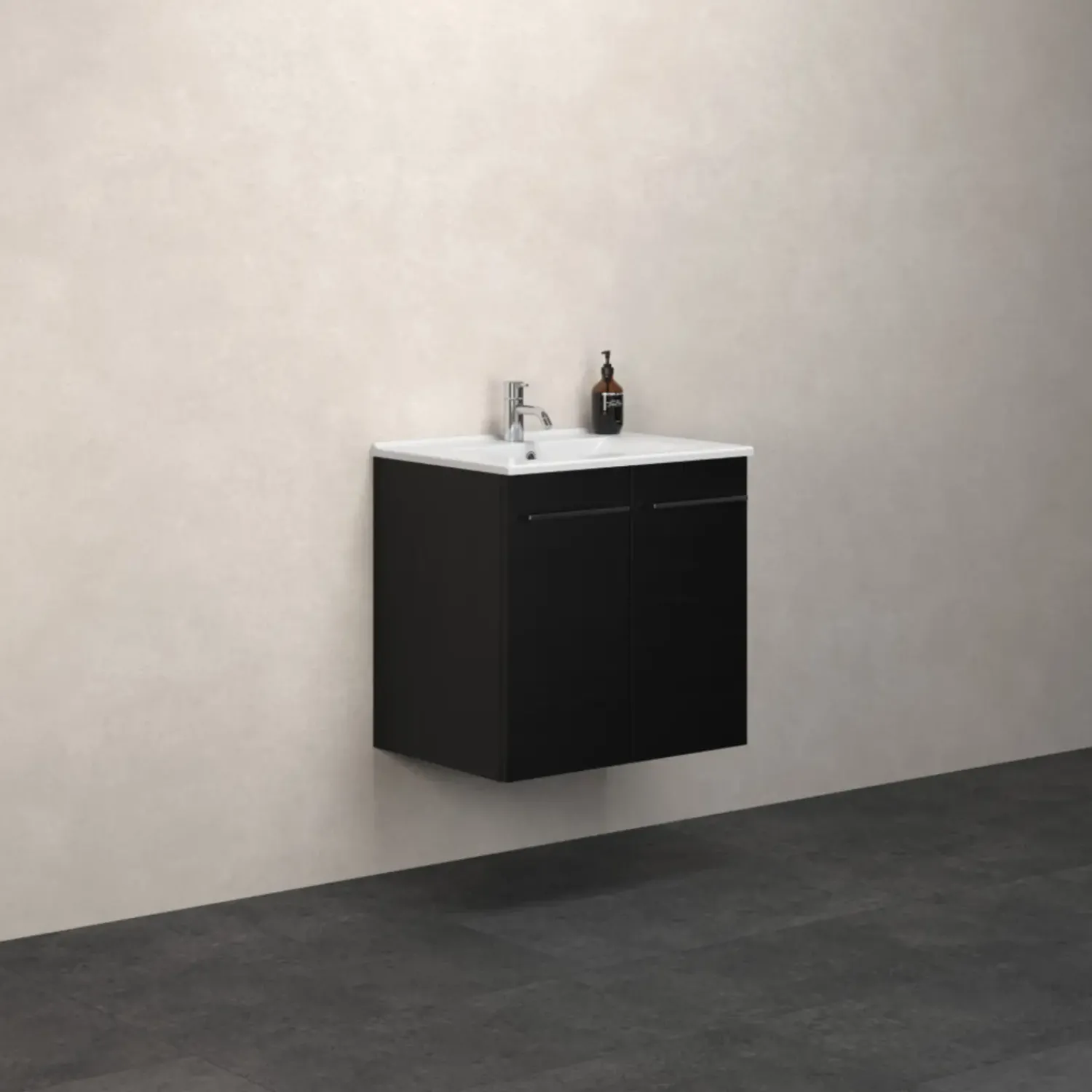 Gå efter en elegant og dristig stil med dette Scanbad Multo badeværelsessæt i sort. Denne sofistikerede farve tilføjer drama og elegance til ethvert badeværelse. Med et 60 cm vaskeskab med to låger og en smuk Amber vask i sanitetsporcelæn får du både luksus og funktionalitet. Bag lågerne finder du god opbevaringsplads til dine badeværelsesartikler, og den nemme rengøring af vasken holder dit badeværelse rent og indbydende.