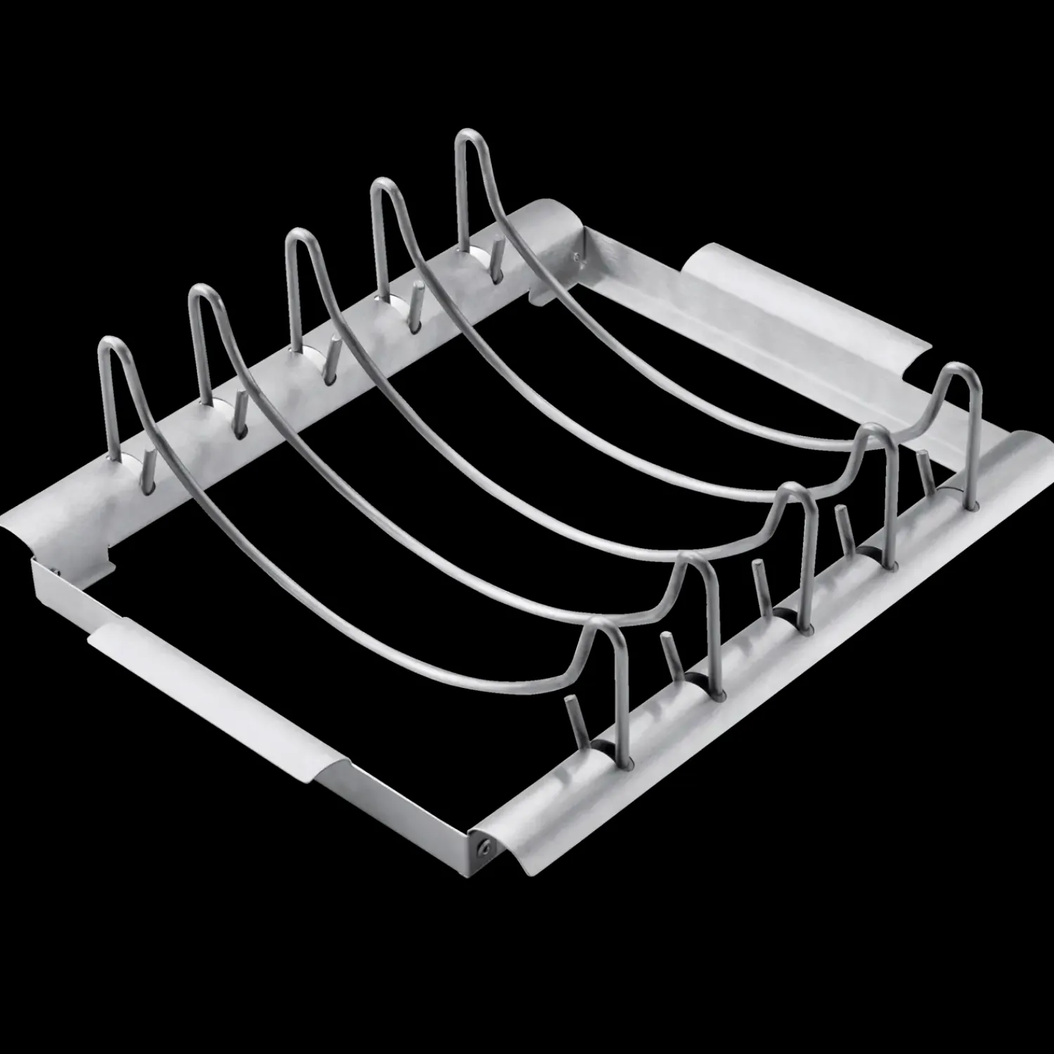 Stegholderen er udstyret med brugervenlige detaljer, såsom 2-i-1 designet der gør at stegholderen kan rumme flere spareribs på en gang, hvilket frigiver plads på grillen. Derudover er det muligt at montere bæretråde, dom kan holde stege eller fire stativer med spareribs.