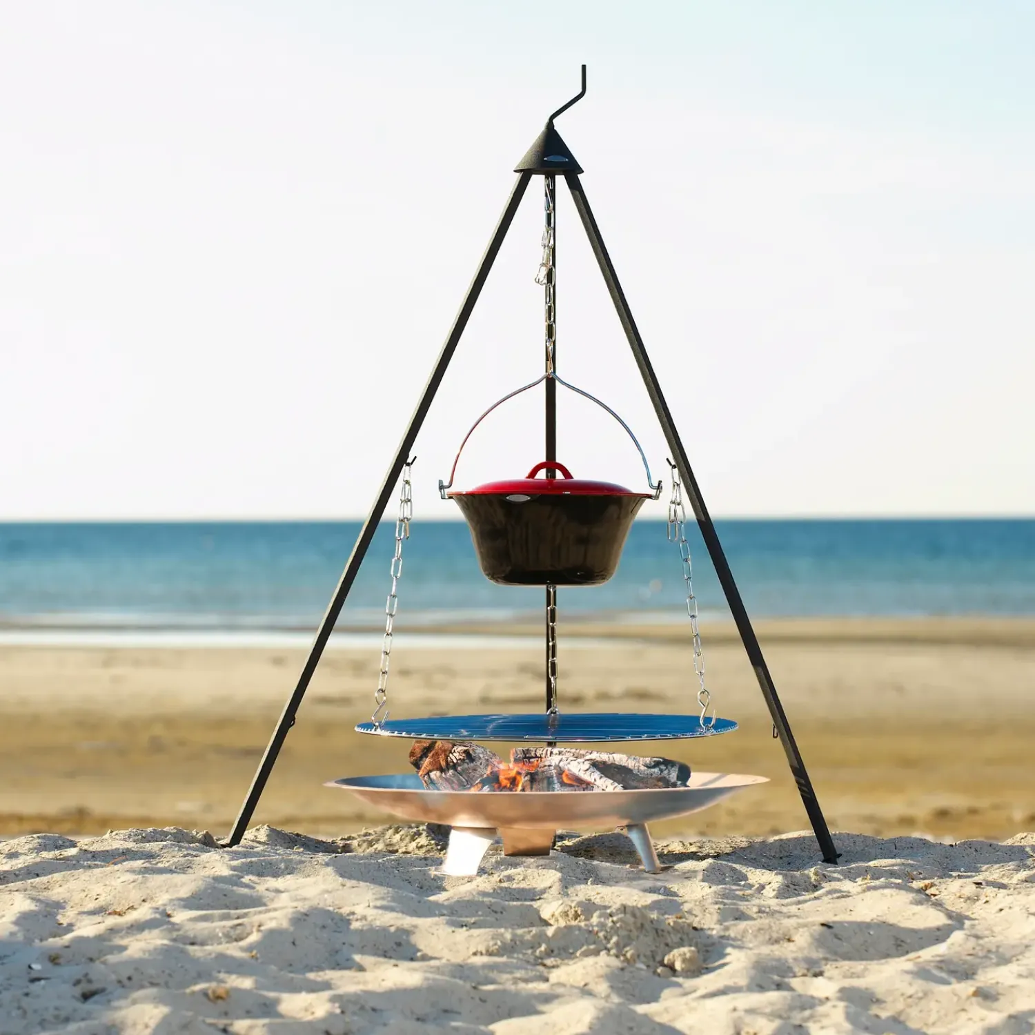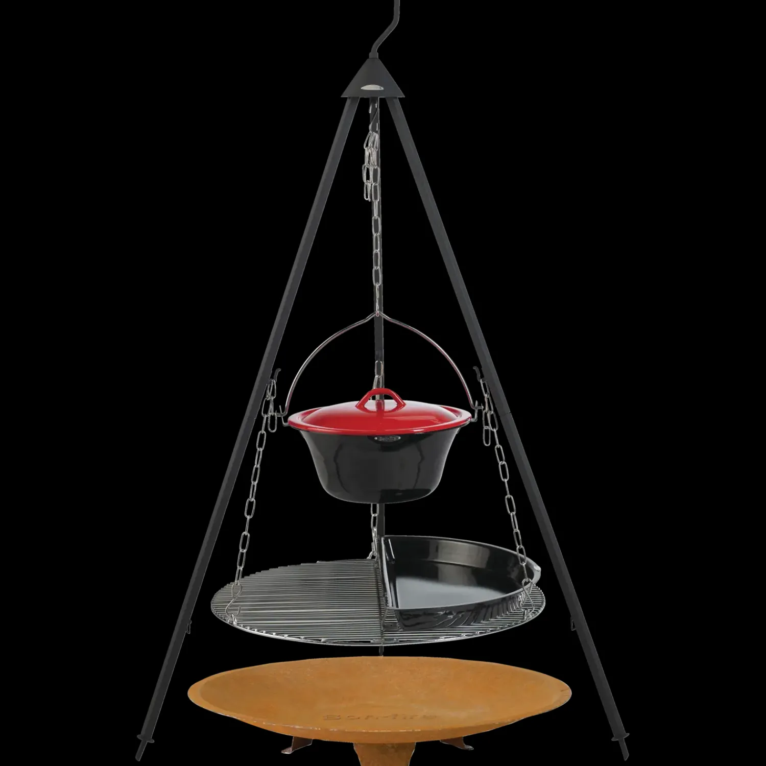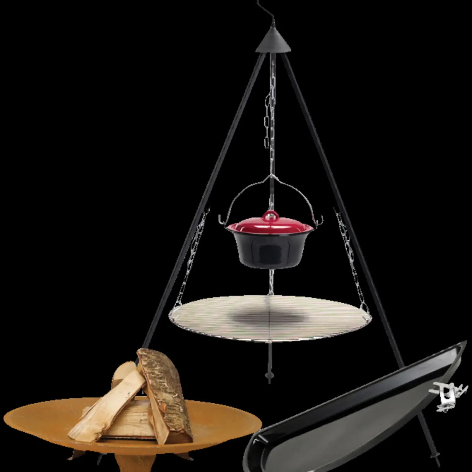 Sættet består af grillrist Ø60 cm, tre ben, kæder til ophæng af grillrist, 6 liter gryde og stor BBQ-pande Ø60 cm.