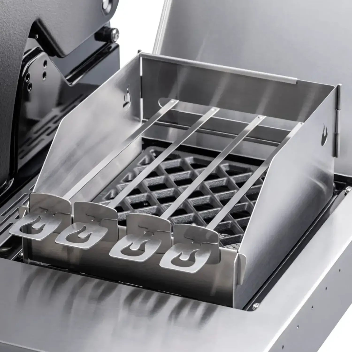 Vindskærm til Sear-burner – bodyguard for vores varmeste flamme. Klap blot vindskærmen op og placer den rundt om Sear-burneren. Dine GRILL+® spid passer perfekt ned i vindskærmen. Nu kan du også grille mad på spid over Sear-bruneren, så du får spid med perfekt grillsmag Vores nye vindskærm til Sear-burneren sikrer dig vindtætte grillglæder Vindskærmen holder stand mod vind og vejr og holder irriterende vindstød væk fra din Sear-burner. Samtidig sørger den varmebestandige metalbeskyttelse for, at din grillmad altid udsættes for en ensartet og ekstrem varme.