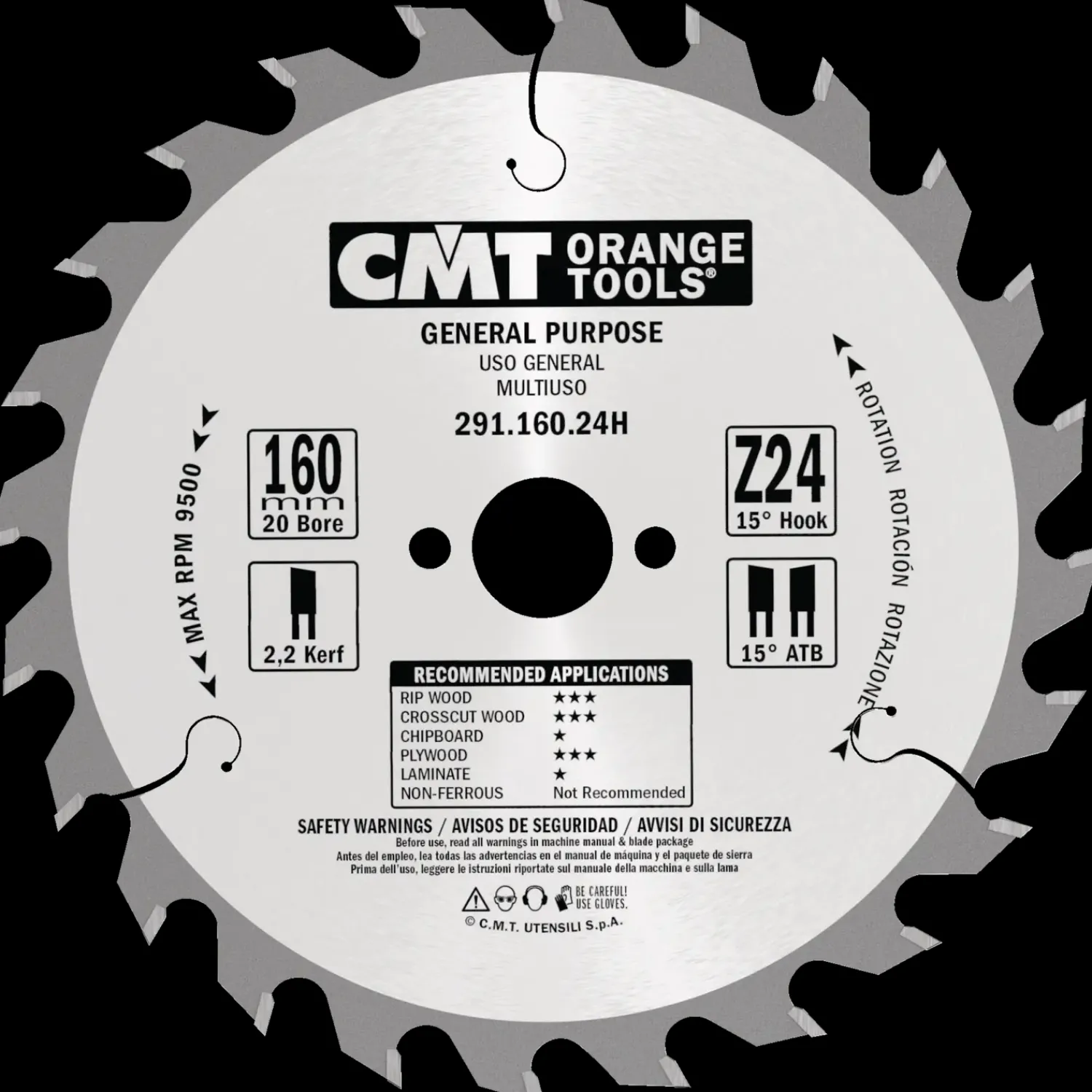 CMT savklinge til længdeskæring og tværskæring af hårdt og blødt træ samt krydsfiner og lignende materialer. Til bl.a. Festool dyksav og andre dyksave., bordsave, geringssave samt transportabel/håndholdte rundsave. Groft snit.