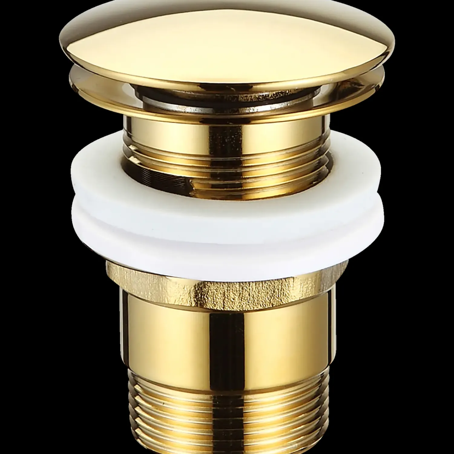ADORA Exitus bundventil med push pop up og høj omløb, samt 1 1/4 bundventil der måler Ø66 mm i diameteren.