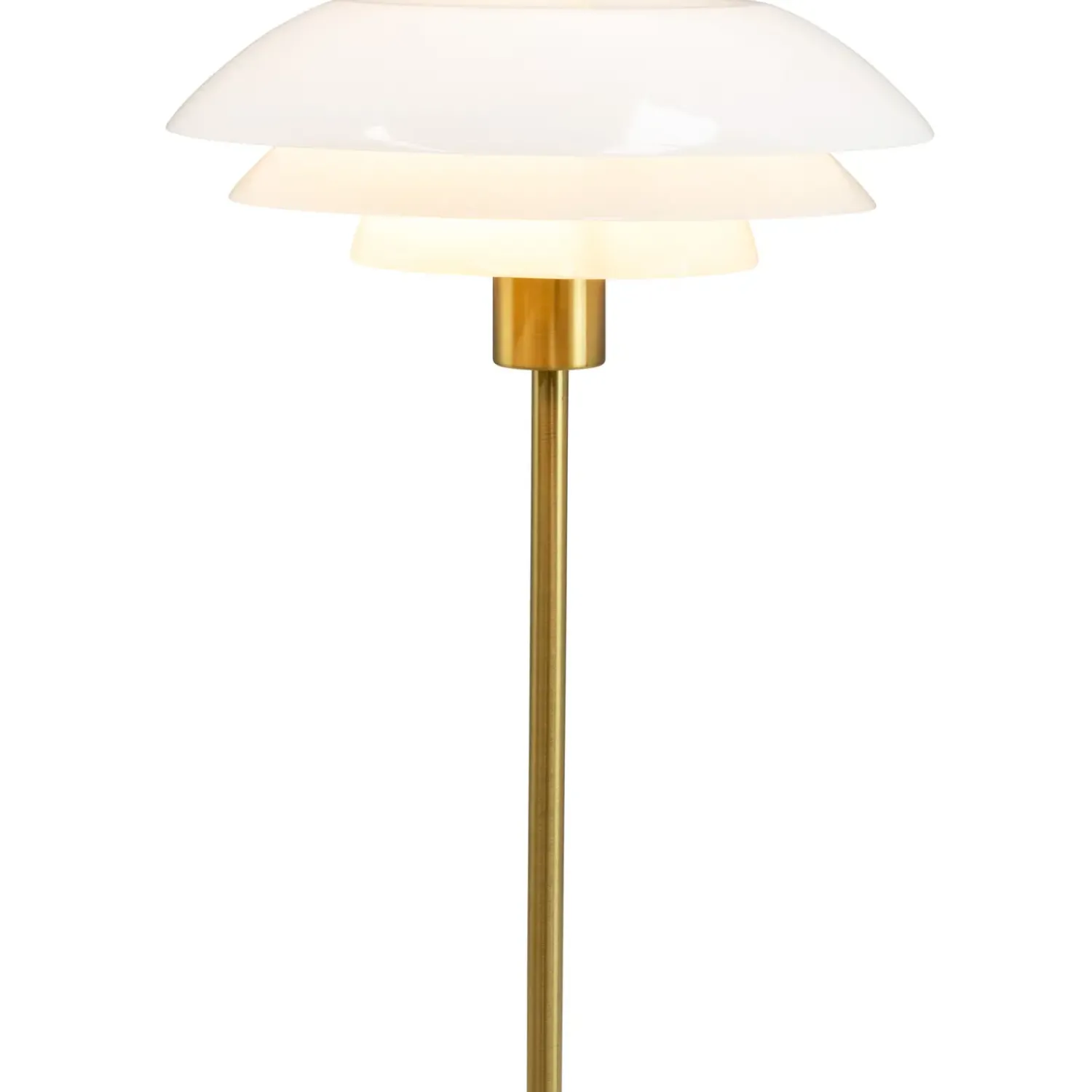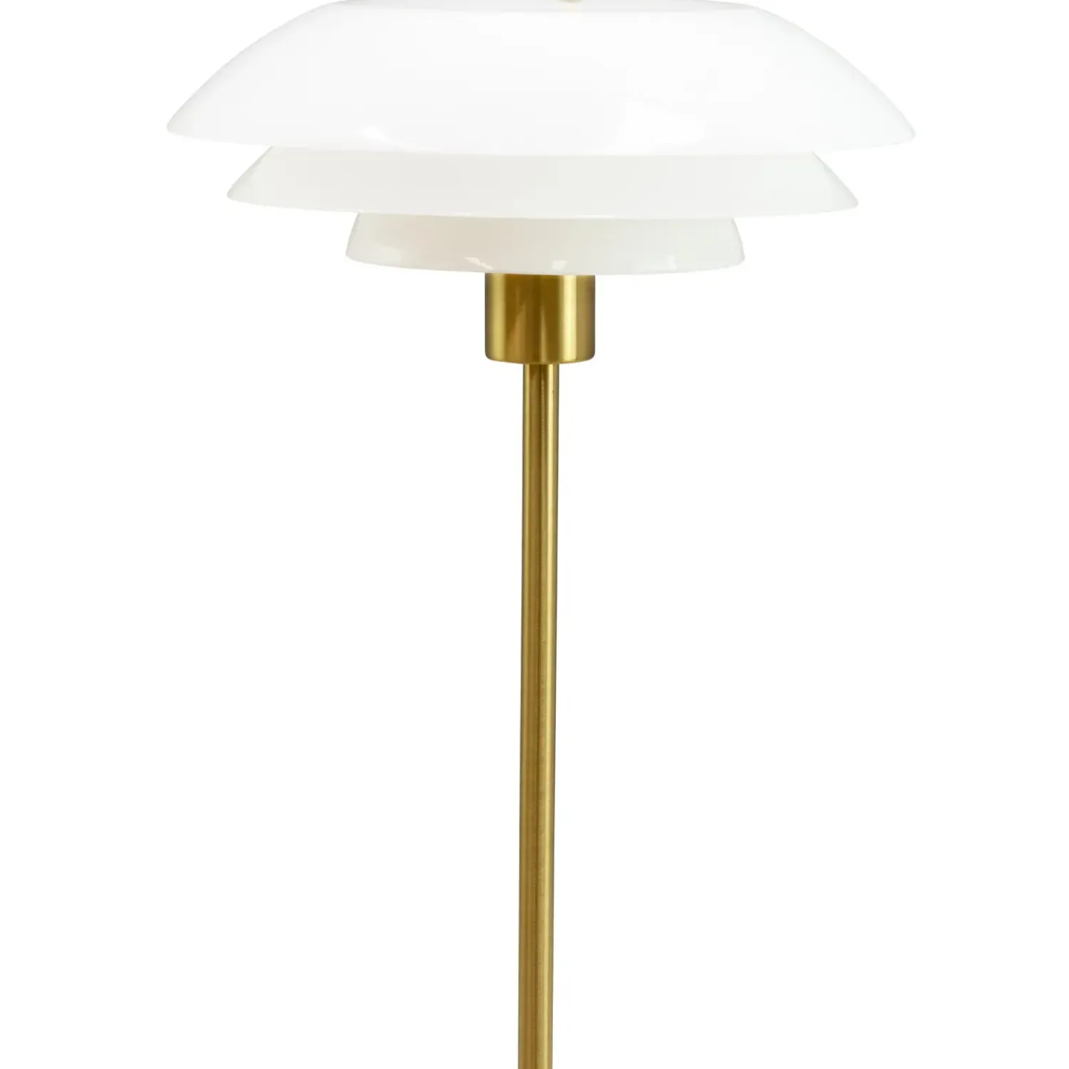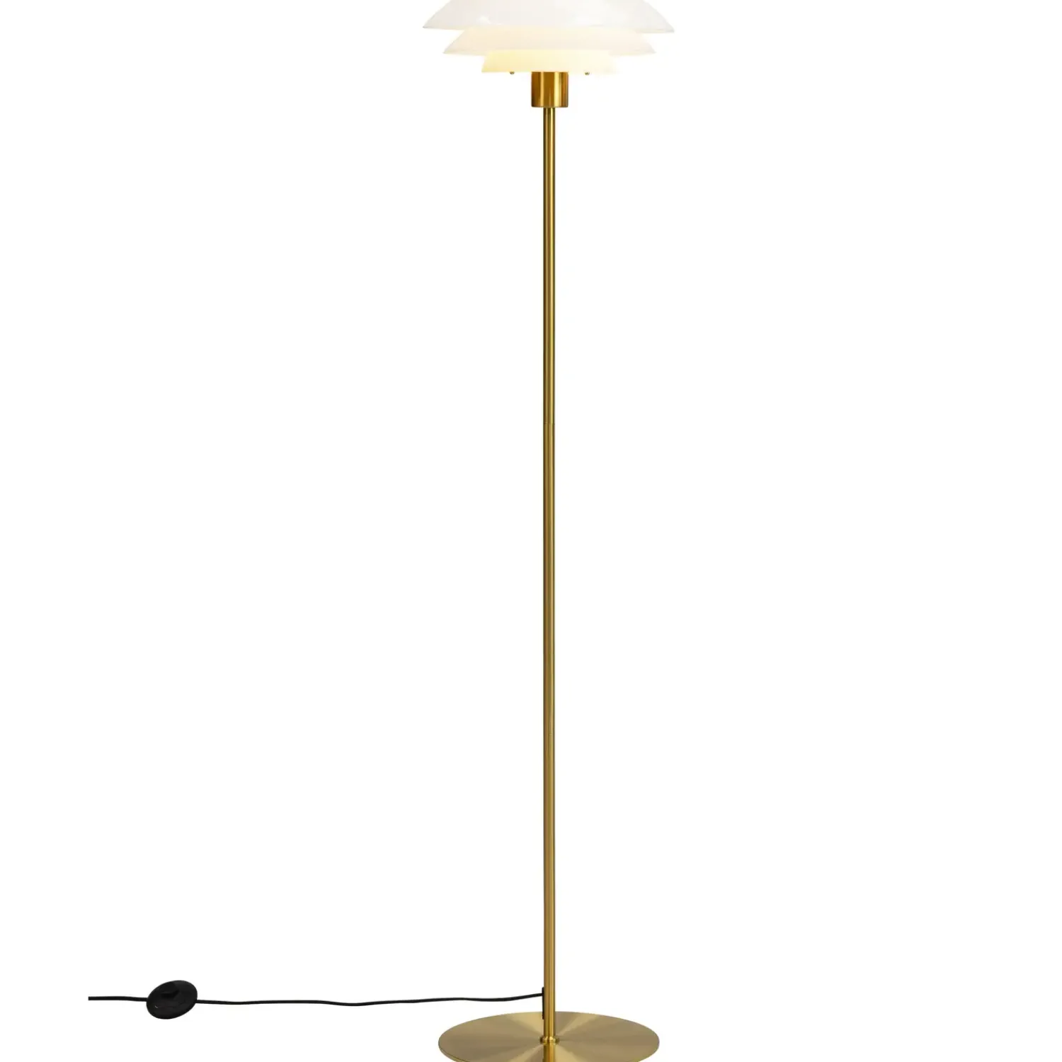 Eksklusiv og smuk gulvlampe med Opal hvid skærm, messing base, stofleding med fod afbryder.
