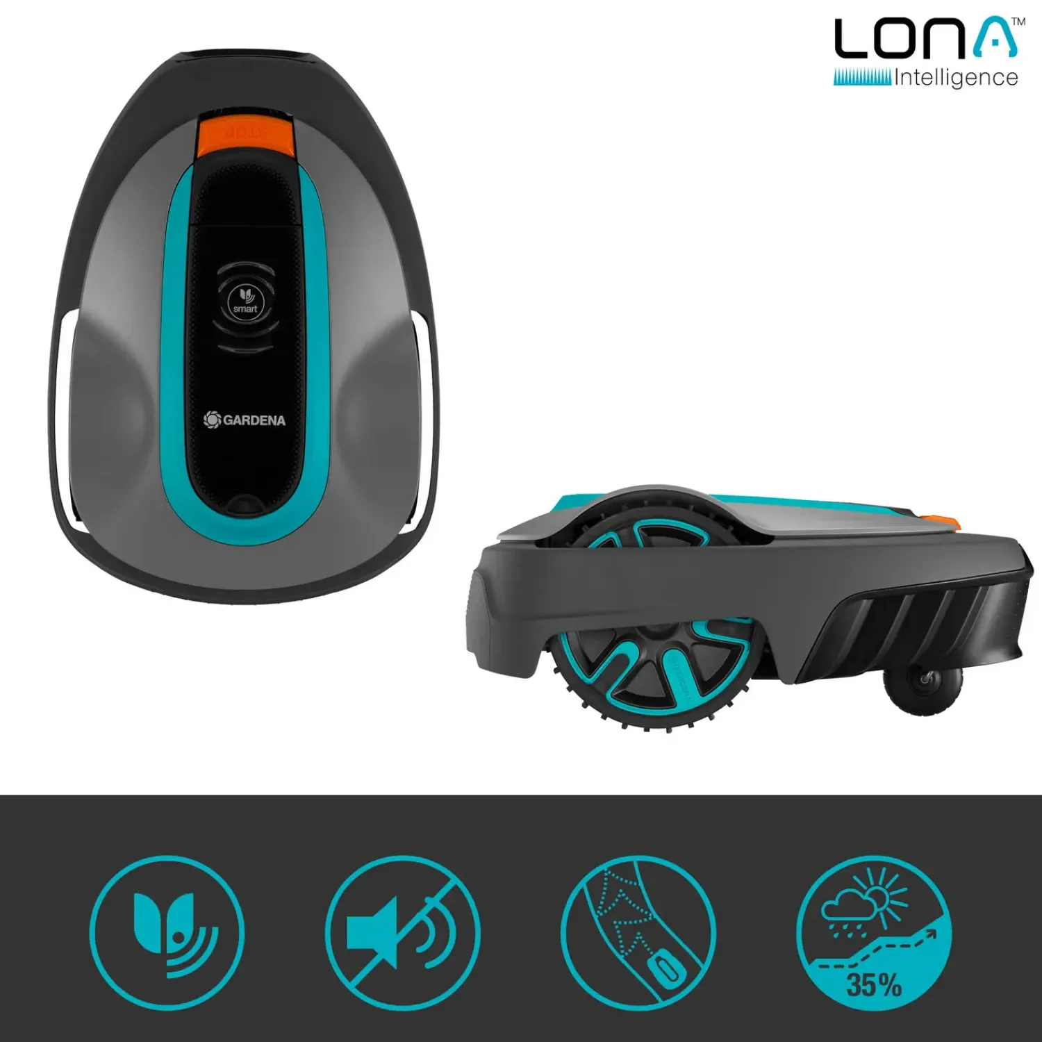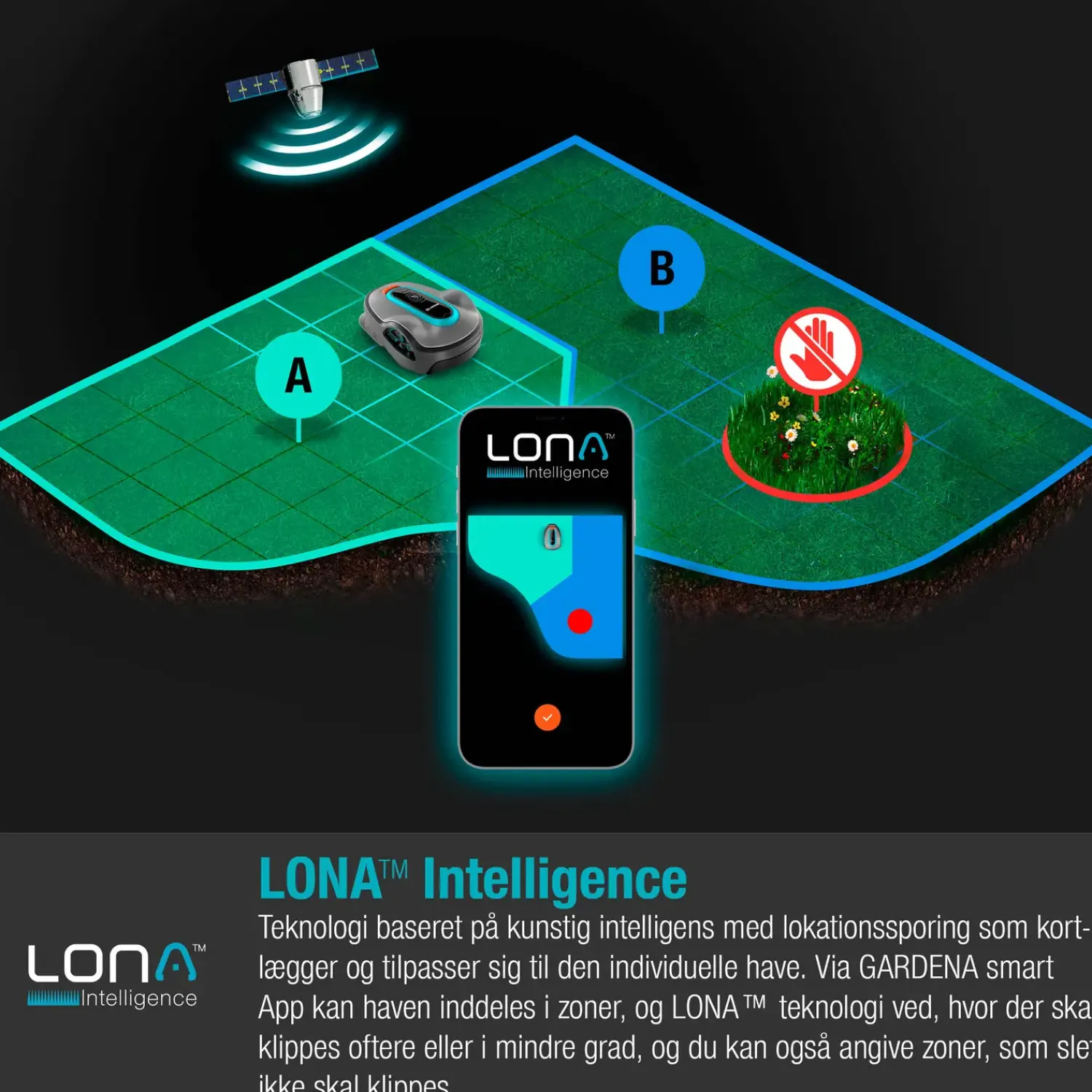 Her får du en højteknologisk robotplæneklipper, der kan styres direkte fra din smartphone med Gardena smart-appen. LONA-teknologi lærer din have at kende ved brug af en AI-baseret kortlægningsteknologi og genererer et kort over græsplænen, som du kan se i appen. På den måde kan du holde øje med robotten i realtid – uanset hvor du befinder dig. Desuden kan du inddele haven i zoner. Du bestemmer selv hvilke områder der skal klippes, hvornår og hvor ofte. Det er også muligt at bestemme arealer der ikke skal klippes – fx hvis du har en vild eng som du ønsker at bevare. Derudover kan du styre robotten med din stemme ved hjælp af Alexa.