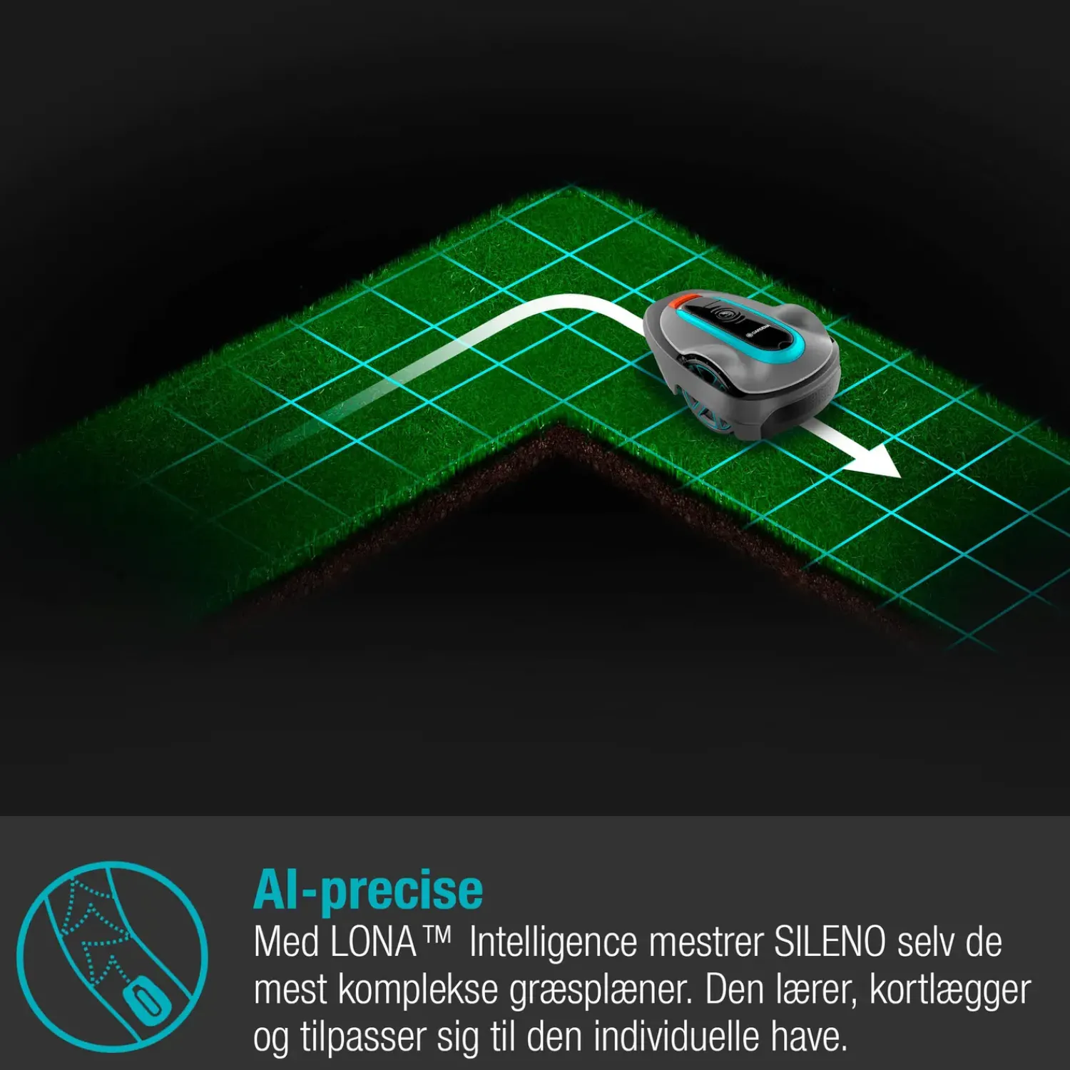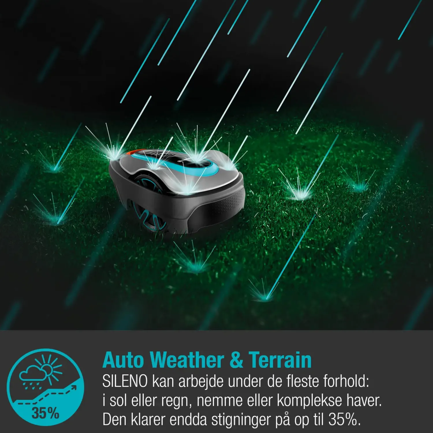 Sileno Life er designet til alle årstider. Den registrerer om jorden er frossen, og vil sætte klipningen på pause indtil jorden er tøet op. Den kan endda klare stigninger på op til 35 % og ved præcis hvornår og hvordan den skal klippe din græsplæne. Når den er færdig med arbejdet, kører den automatisk tilbage i ladestationen, så du ikke skal foretage dig noget som helst.