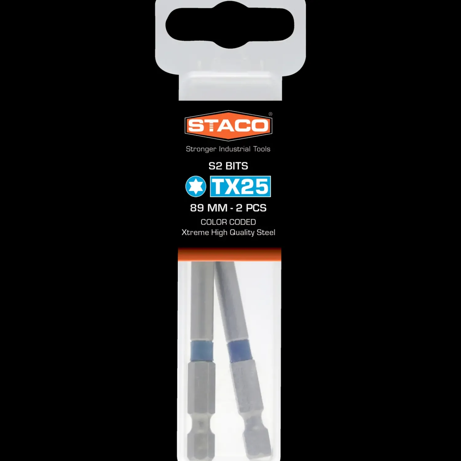 Kvalitetsbits i certificeret S2 stål sikrer lang levetid og god brudstyrke. STACOs farvebits er kodet efter bitsenes størrelse. Det gør det nemt at adskille bitsene fra hinanden og hurtigt finde den korrekte størrelse.