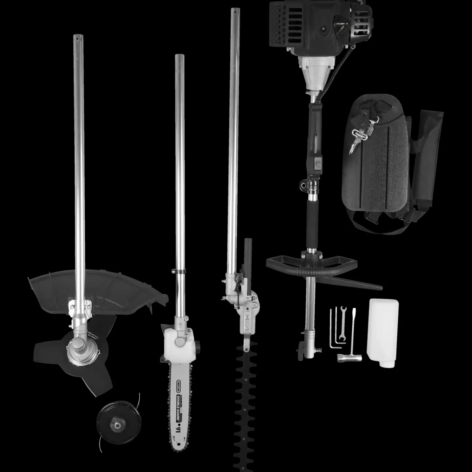 Benzindrevet buskrydder, græstrimmer, grensav og hækkeklipper