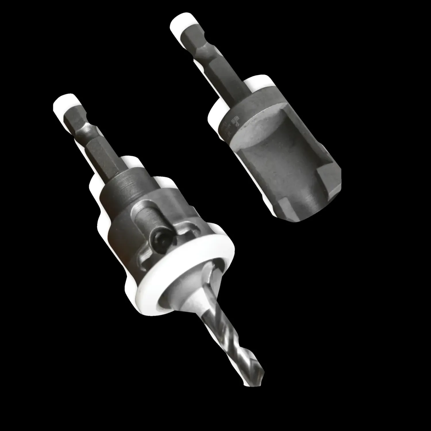 Propbor og forsænkersæt fra DVA. Forsænker er med hårdmetal-skær og dybde stop med beskyttende nylonring samt propbor af hærdet stål.