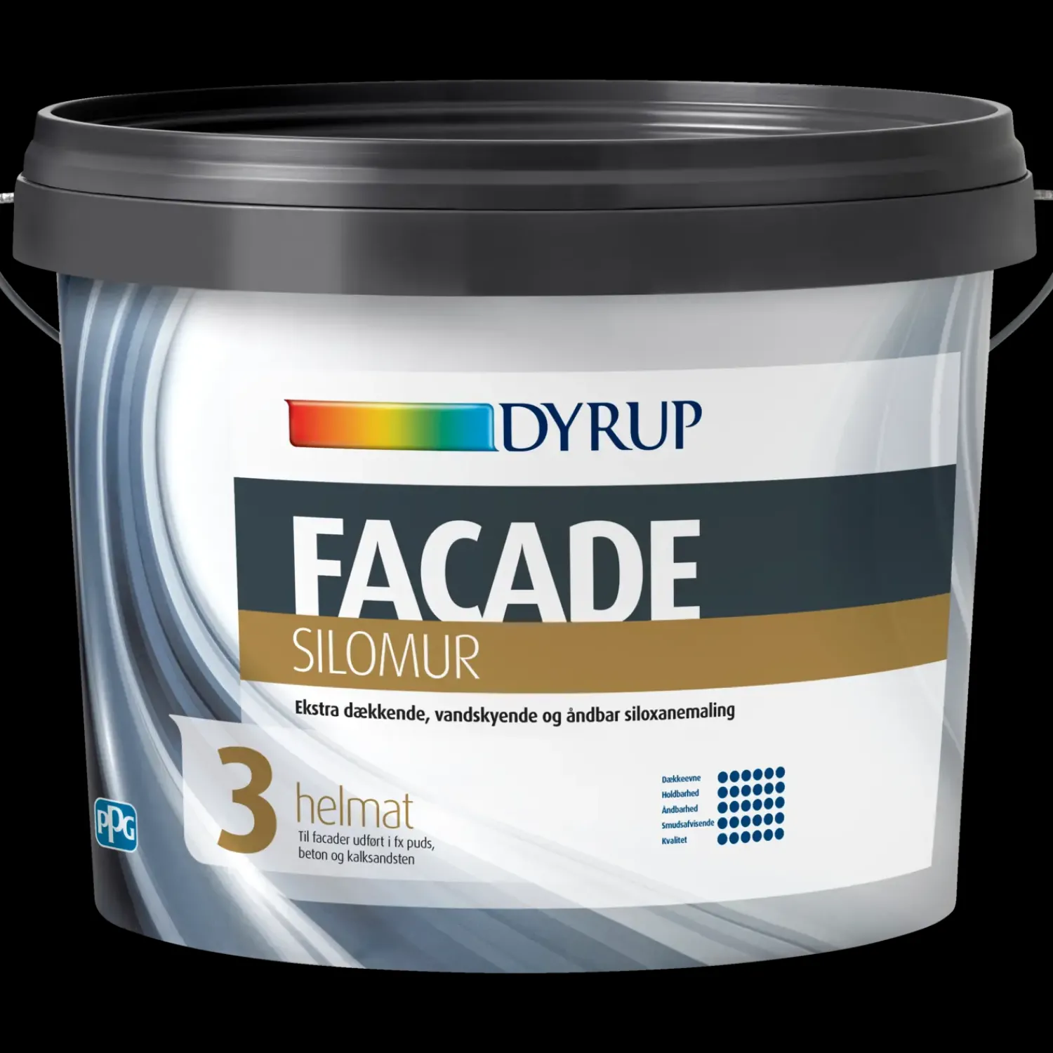 Dyrup Facade Silomur er en acrylforstærket siloxanemaling. Malingen har en ekstrem god dækkeevne og en stærkt vandskyende effekt. Det tillader murværket at ånde, da malingen er diffusionsåbent.