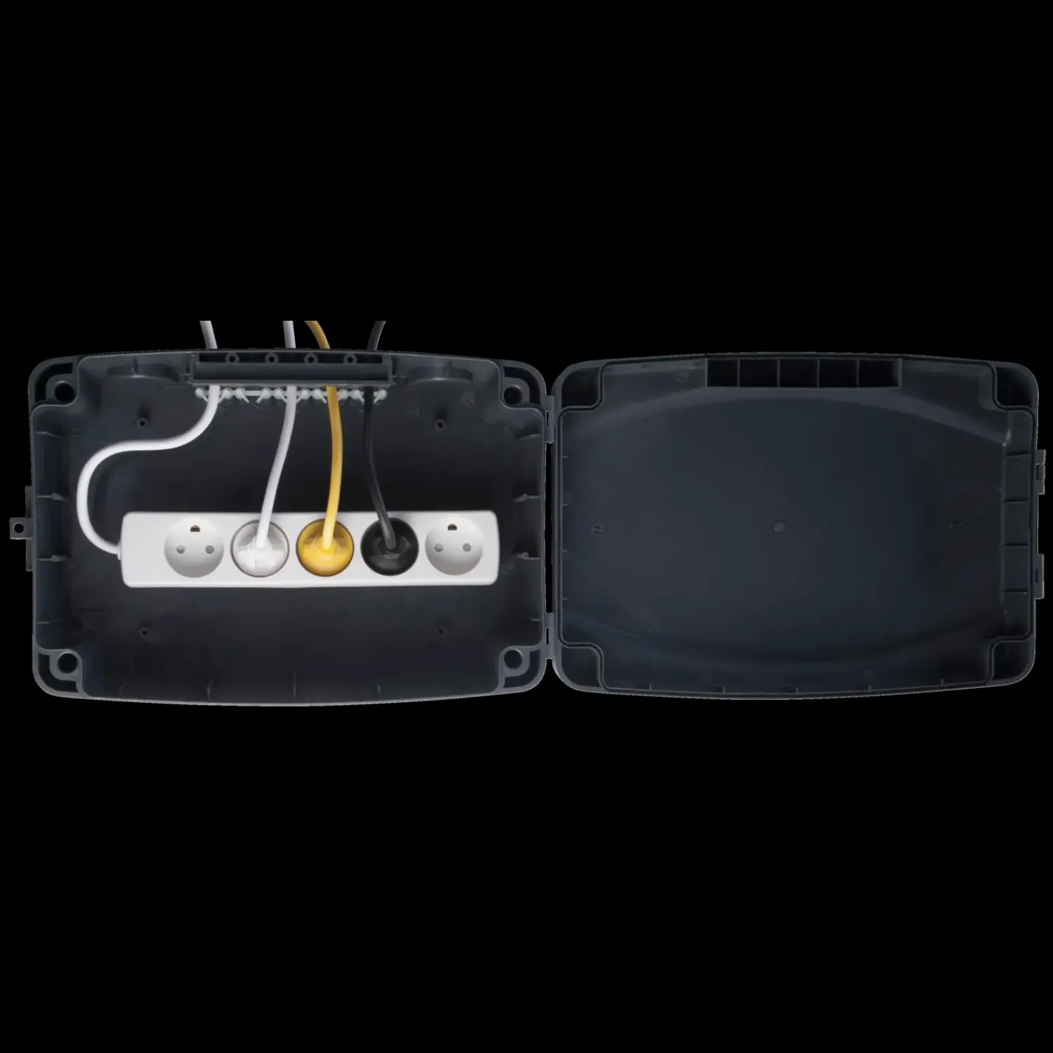 Til udendørs brug. beskytter mod vand. støv og snavs. Passer til transformere. 5-vej stikdåse. timere og forlængerledninger. Kan hænge på væg eller fritstående. 5 ind-udgange. 2 stk. udslagsblanketter M20/25.