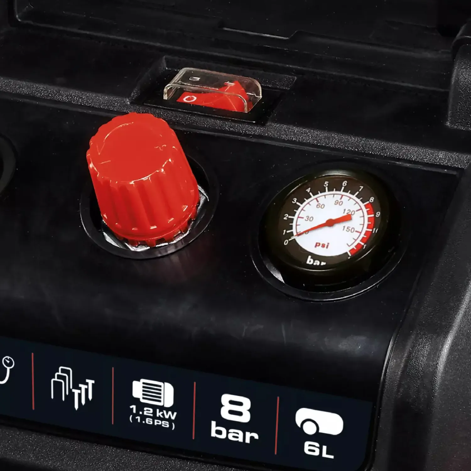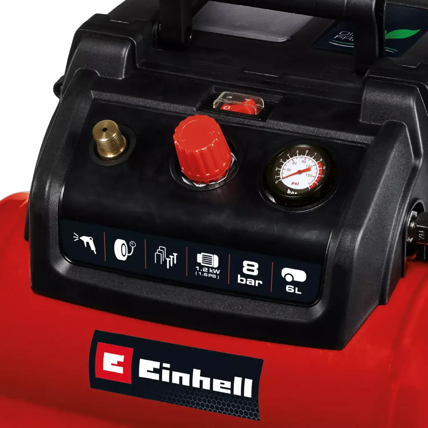 Einhell kompressor TC-AC 190/6/8 OF er en rigtig allround-maskine til de mange forskellige opgaver i hjemmet, på værkstedet og i garagen. Med de rigtige værktøjer kan kompressoren anvendes til talrige opgaver: fra maling over oliering til blæse- og rengøringsopgaver. Dæk, bolde og madrasser pumpes op i en håndevending. Den kraftfulde motor arbejder med hele 1,2 kW og et omdrejningstal på 18.000 omdrejninger i minuttet og kræver kun meget lidt vedligeholdelse. Den integrerede oliefri pumpe leverer et driftstryk på op til 8 bar ved en indsugningseffekt på 190 liter i minuttet og et pumpeomdrejningstal på op til 3.800 omdrejninger i minuttet. Den mobile kompressor er forsynet med en tryklufttank på 6 liter, som tillader et vedvarende arbejde. Kabelopvikleren på bag siden af huset et praktisk. Krog og opbevaringsrum til ekstratilbehør er integreret i huset. Takket være trykbegrænseren, der kan reguleres op til 8 bar, kan kompressoren udføre en lang række opgaver. Manometer og lynkobling af hensyn til et reguleret arbejdstryk medfølger. Fødderne sørger for en sikker stabilitet under driften. Sikkerhedsventilen understøtter brugerens sikkerhed. Tømningsskruen muliggør en komfortabel vedligeholdelse. Einhell yder ti års garanti mod gennemtæring af kedlen.