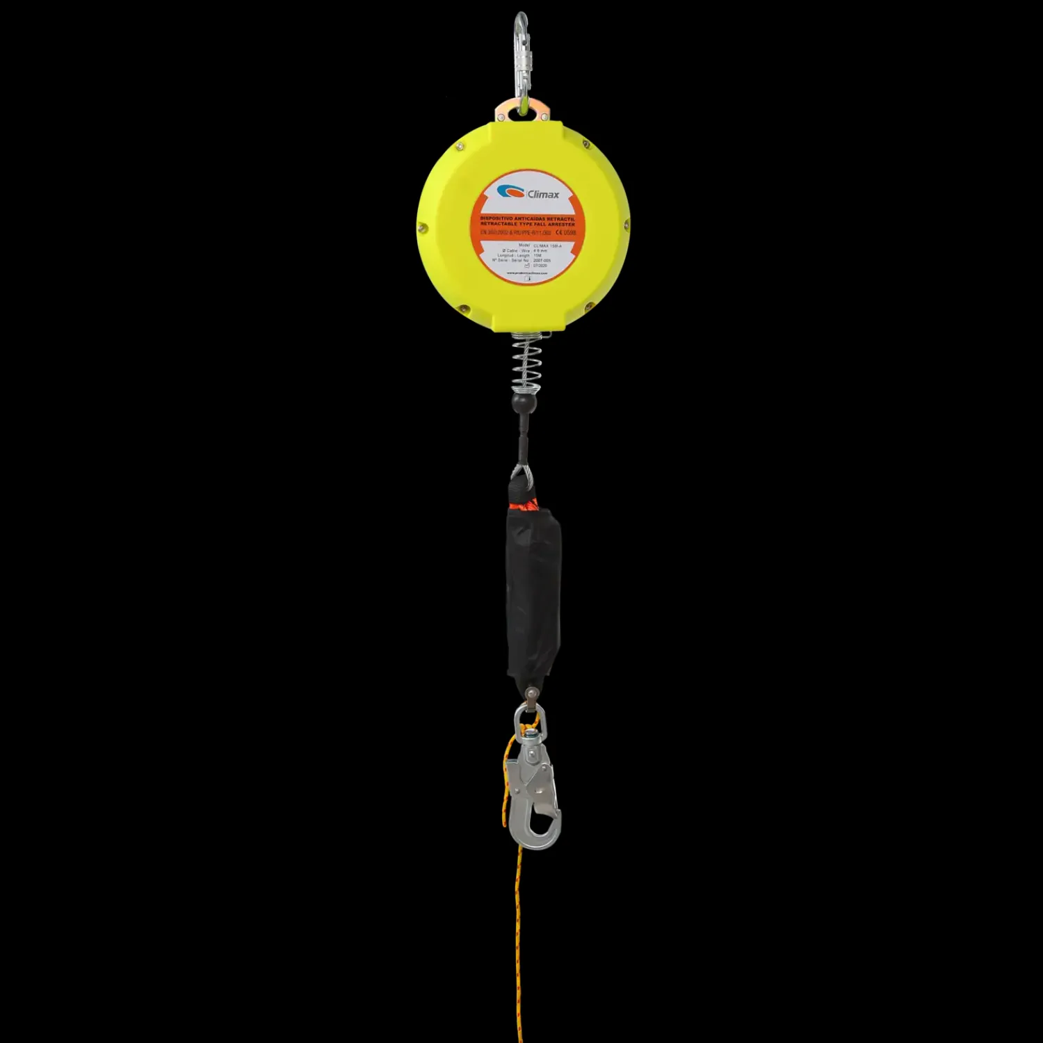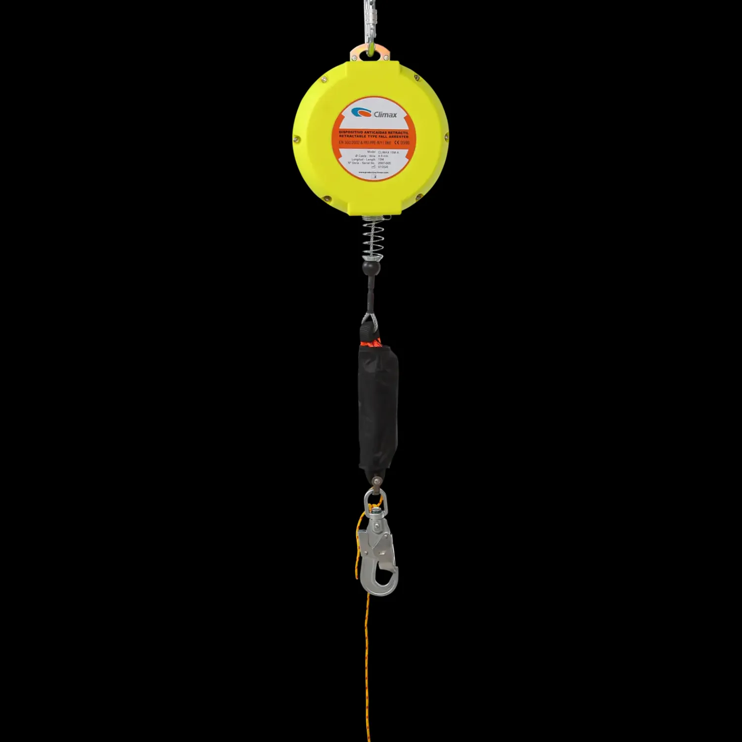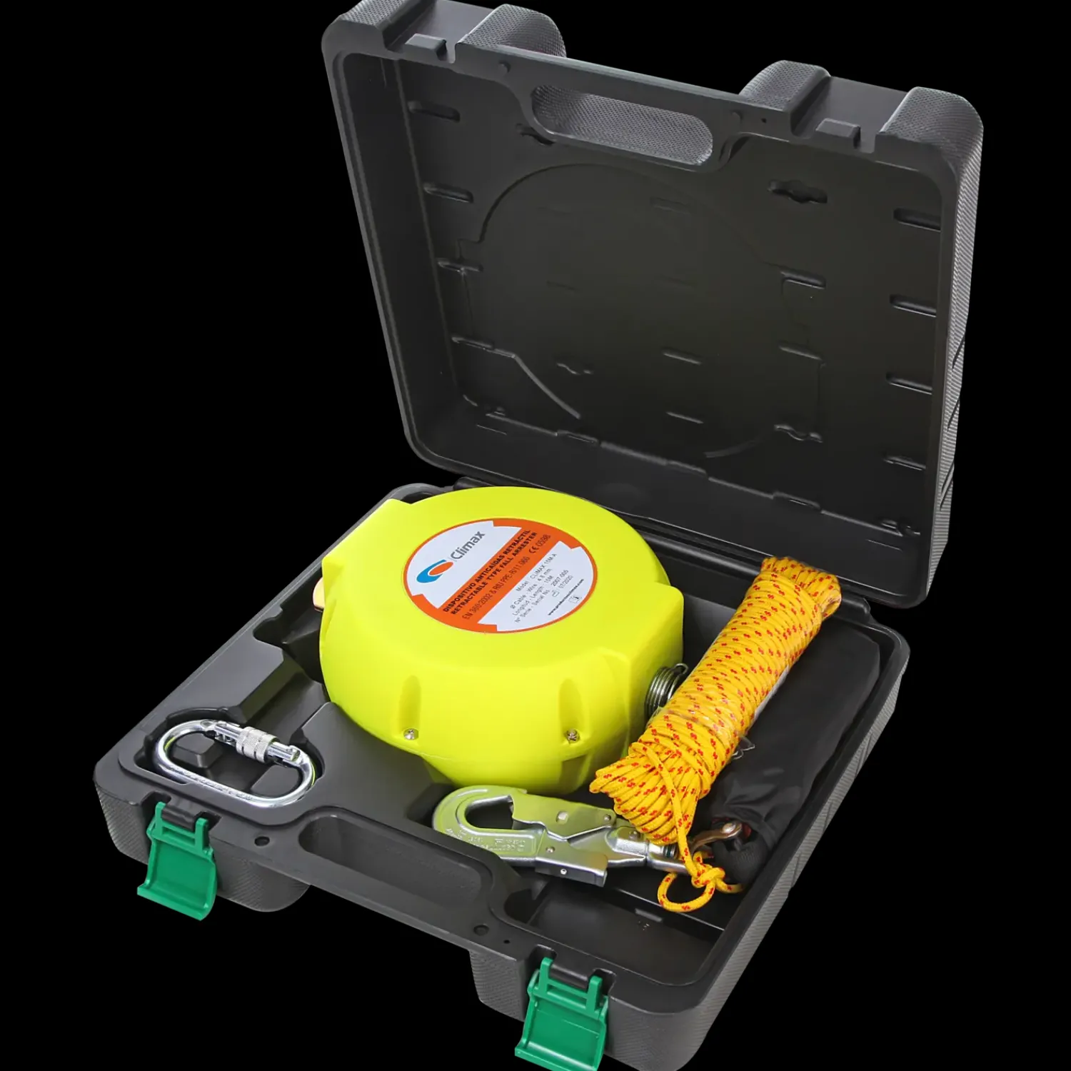 Faldsikringsblok med skruekarabin og 4 mm galvaniseret stålwire med krog. Faldblok med Automatisk bremsessystem og kanttestet. Faldblokken kan anvendes horisontalt og vertikalt og er udstyret med en energiabsorber.