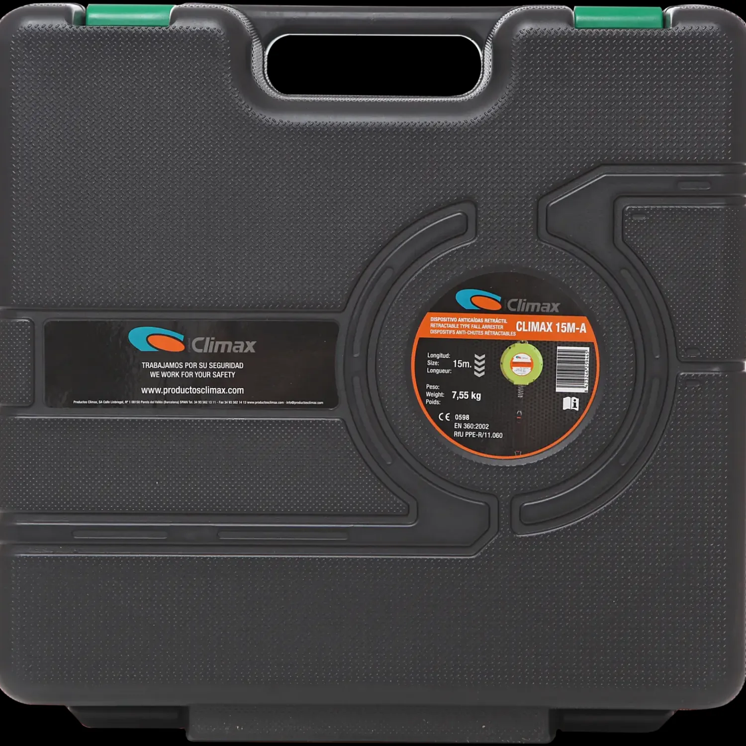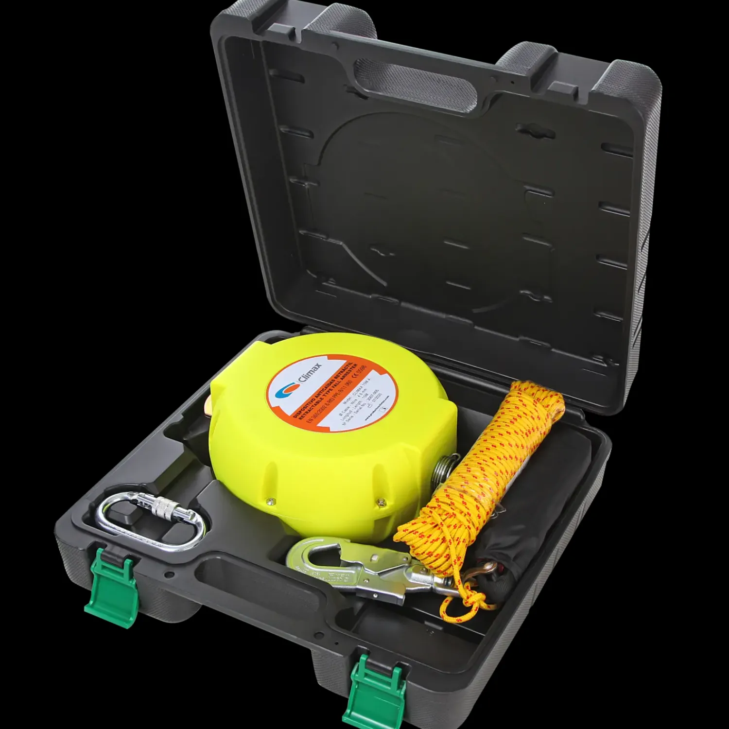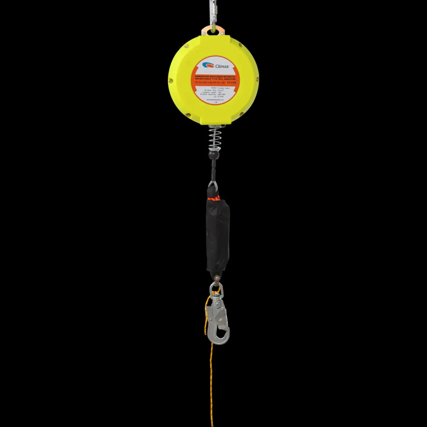 Faldsikringsblok med skruekarabin og 4 mm galvaniseret stålwire med krog. Faldblok med Automatisk bremsessystem og kanttestet. Faldblokken kan anvendes horisontalt og vertikalt og er udstyret med en energiabsorber.