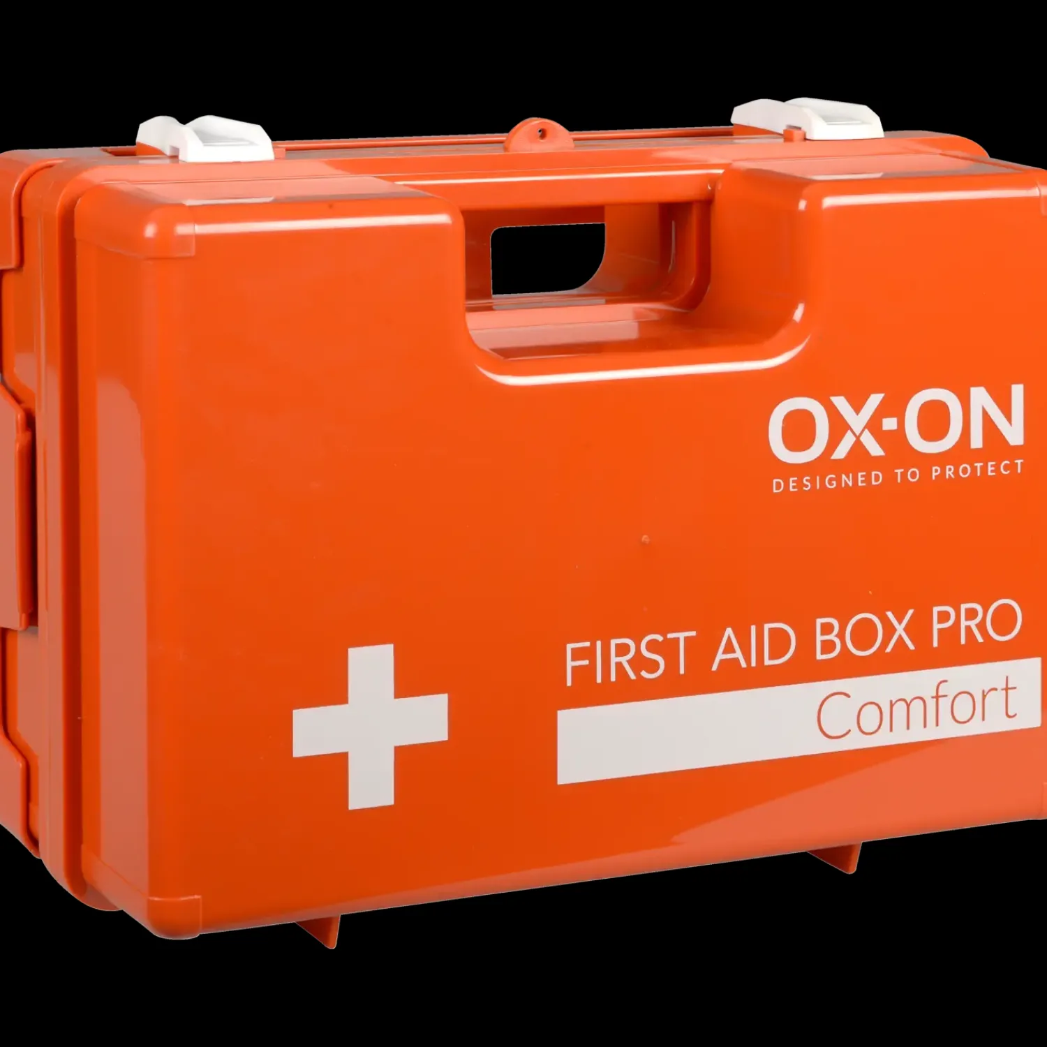 OX-ON First Aid Box Pro Comfort er en professionelt sammensat og ruminddelt kuffert med førstehjælpsudstyr til den mindre eller mellemstore virksomhed med mellem 1 og 50 ansatte. First Aid Box Pro Comfort er udført i slagfast ABS materiale, så den efterlever DIN 13157 standard. Med førstehjælpskufferten får du alle de nødvendige remedier, der skal til for at yde førstehjælp i forbindelse med en ulykke eller hændelse. Til sættet medfølger et praktisk vægbeslag, som giver dig mulighed for at hænge kufferten op, så den er synlig og let tilgængelig. OX-ON First Aid Box Pro Comfort indeholder: 1 stk taperulle 2,5 cm x 5 m. 1 sæt elastisk plaster 10 cm x 6 cm (8 stk.) 4 stk plaster 4 x 6,5 cm 4 stk plaster 1,9 x 7,2 cm 8 stk plaster 2,5 x 7,2 cm 4 stk plaster 2 x 12 cm 1 stk gazekompres 6 x 8 cm 3 stk gazekompres 8 x 10 cm 3 pk gazekompres 10 x 10 cm (2 stk. pr. pk.) 1 stk gazekompres 10 x 12 cm 1 stk gazebind 60 x 80 cm 2 stk øjenkompres 5,5 x 7,5 cm 1 stk ispose 1 stk alu-tæppe 160 x 210 cm 2 stk elastisk bandage 6 x 400 cm 2 stk elastisk bandage 8 x 400 cm 2 stk armklæde 96 x 96 x 136 cm 1 stk saks 2 stk plastposer m. lynlås 5 stk servietter 20 x 30 cm 4 stk engangshandsker 1 stk førstehjælpsvejledning Kuffertens mål er: 280 x 200 x 115 mm
