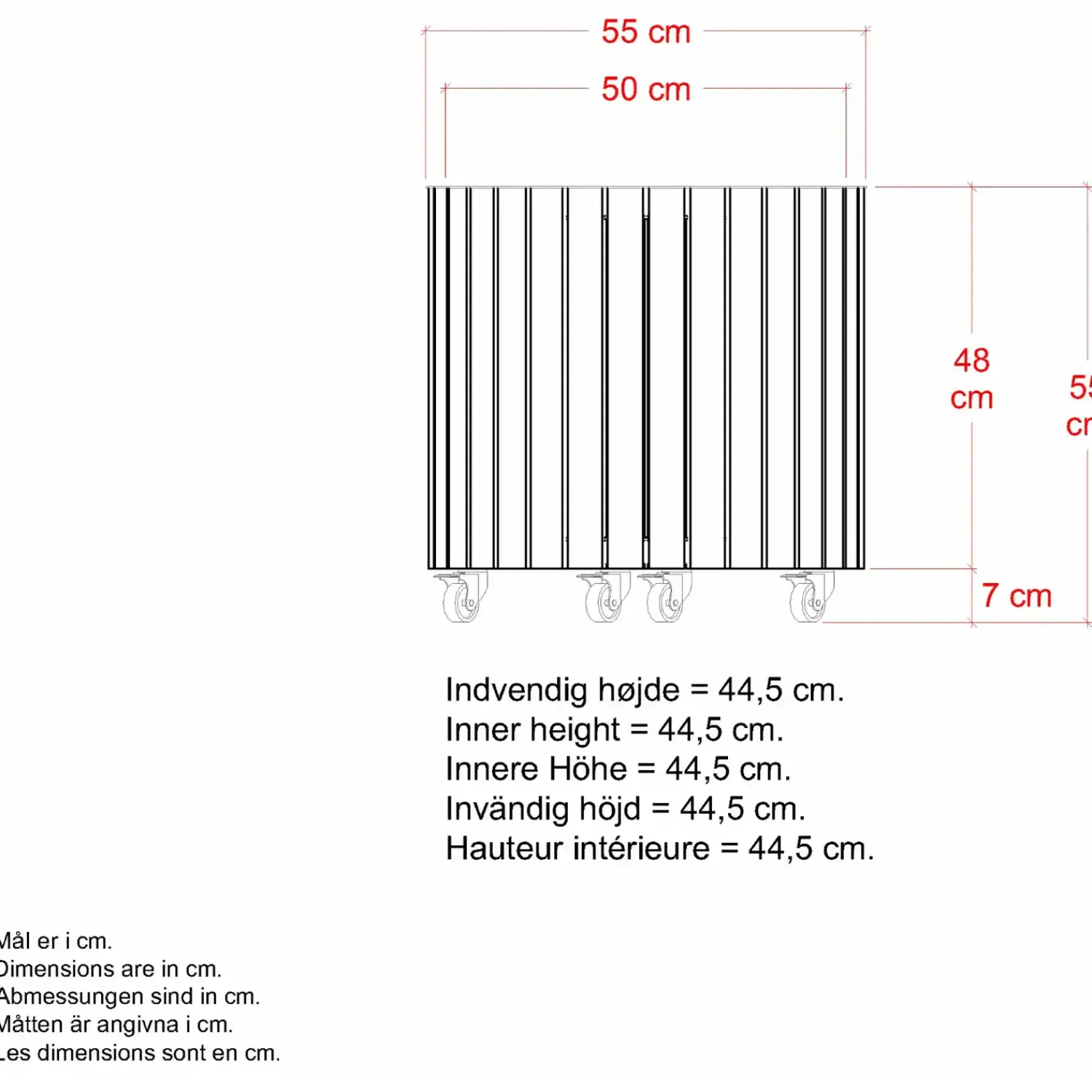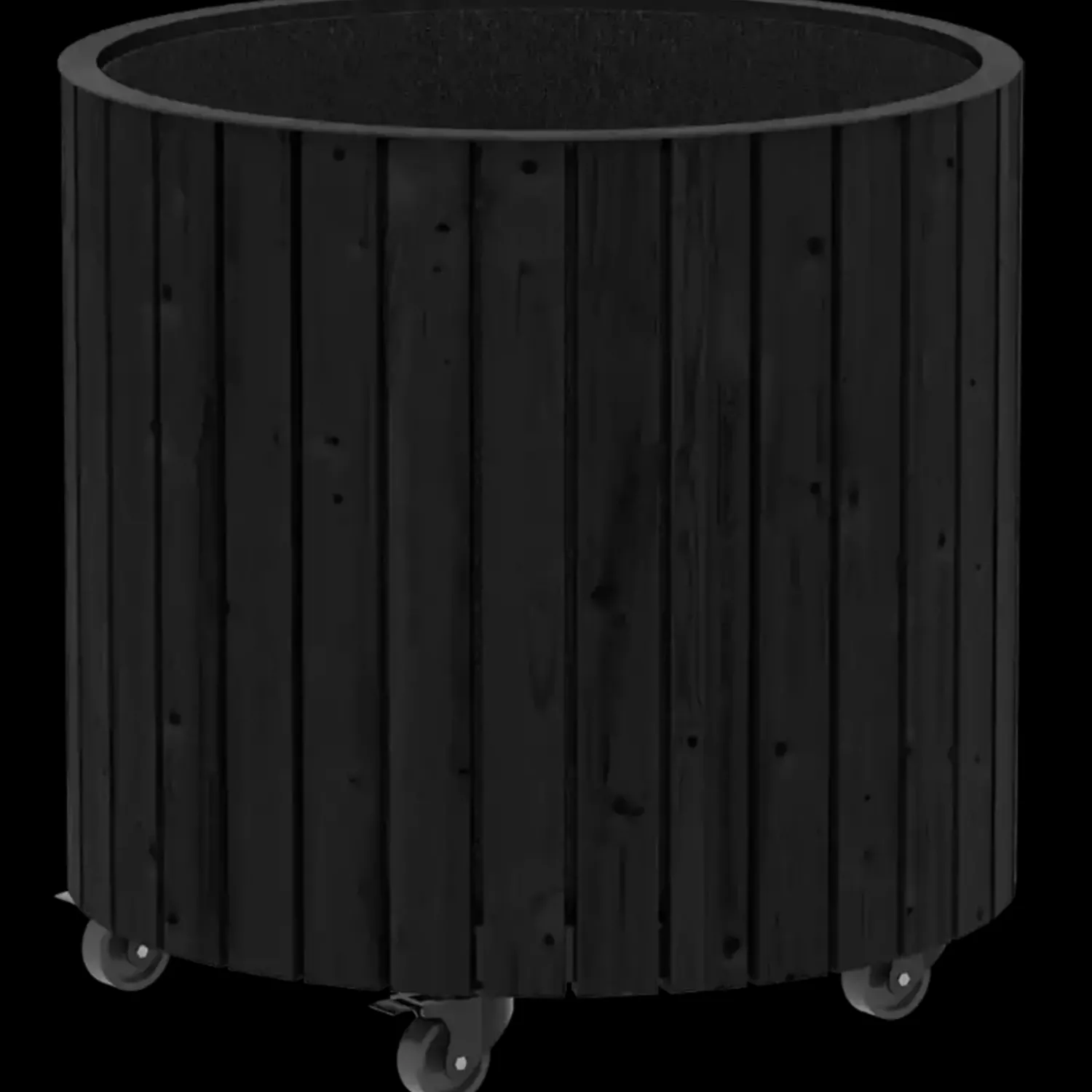 Circle plantekasse – Ø55/55 cm – 18373-15Elegant og praktisk plantekasse med hjul, som er ideel til både blomster, planter, grøntsager og krydderurter.Det enkle design med lodrette trælister passer perfekt ind i tidens trend og har et naturligt look, som skaber en hyggelig atmosfære.Med Circle plantekasser er det nemt at skabe en hyggelig oase eller en lille køkkenhave på altanen, terrassen eller ved indgangspartiet.Kasserne er ideelle både til en lille altan og en stor terrasse, og de fleste planter, blomster, grøntsager og krydderurter trives fremragende deri.Med Circle plantekasser kan du undgå ømme knæ og passe dine planter i en god arbejdsstilling. Kasserne er samtidig ideelle til ruminddeling og som afskærmning på altanen og terrassen.Lister:19×45 mm.Fungicidbehandlet og grundmalet sort 2 gange.Nærmeste RAL 9005 – vandbaseret.Leveres færdigmonteret på bånd.Stål – top/bund:Galvaniseret og pulverlakeret stål.Sort RAL 9005.Hjul:Ø50 mm – 4 stk. med stop (bremselås).Højde på plantekasse: – med hjul 55 cm.- uden hjul 48 cm.Inkl. rund PE-plantepose (sort).Leveres som “Saml selv”.