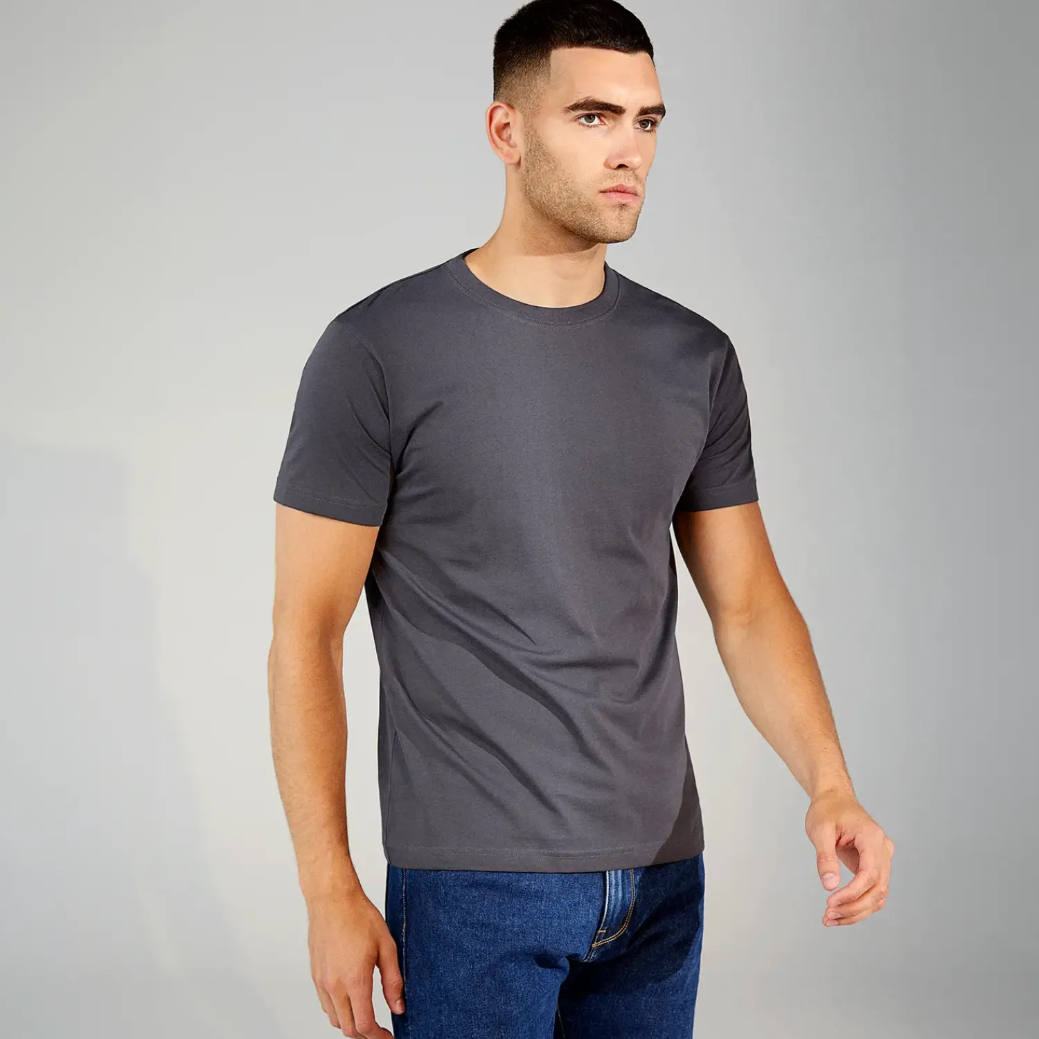 Klassisk T-shirt med rund hals, fire-lags halsrib og nakke- og skulderbånd. Holder faconen vask efter vask.