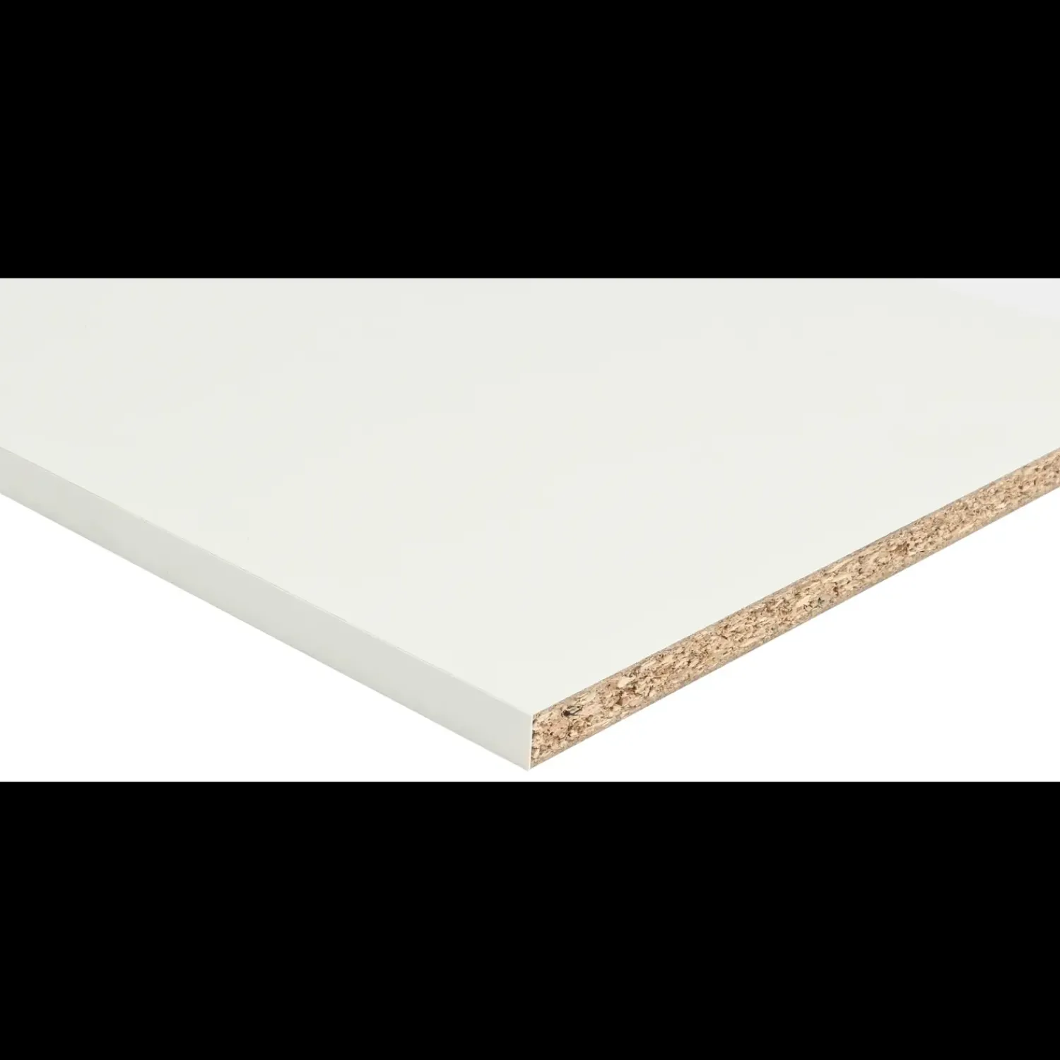 Alsidig hobbyplade i hvid melamin med spån-kerne, kantet på 2 langsider, kan anvendes som hylde, bordplade, bygning af reol og meget mere.