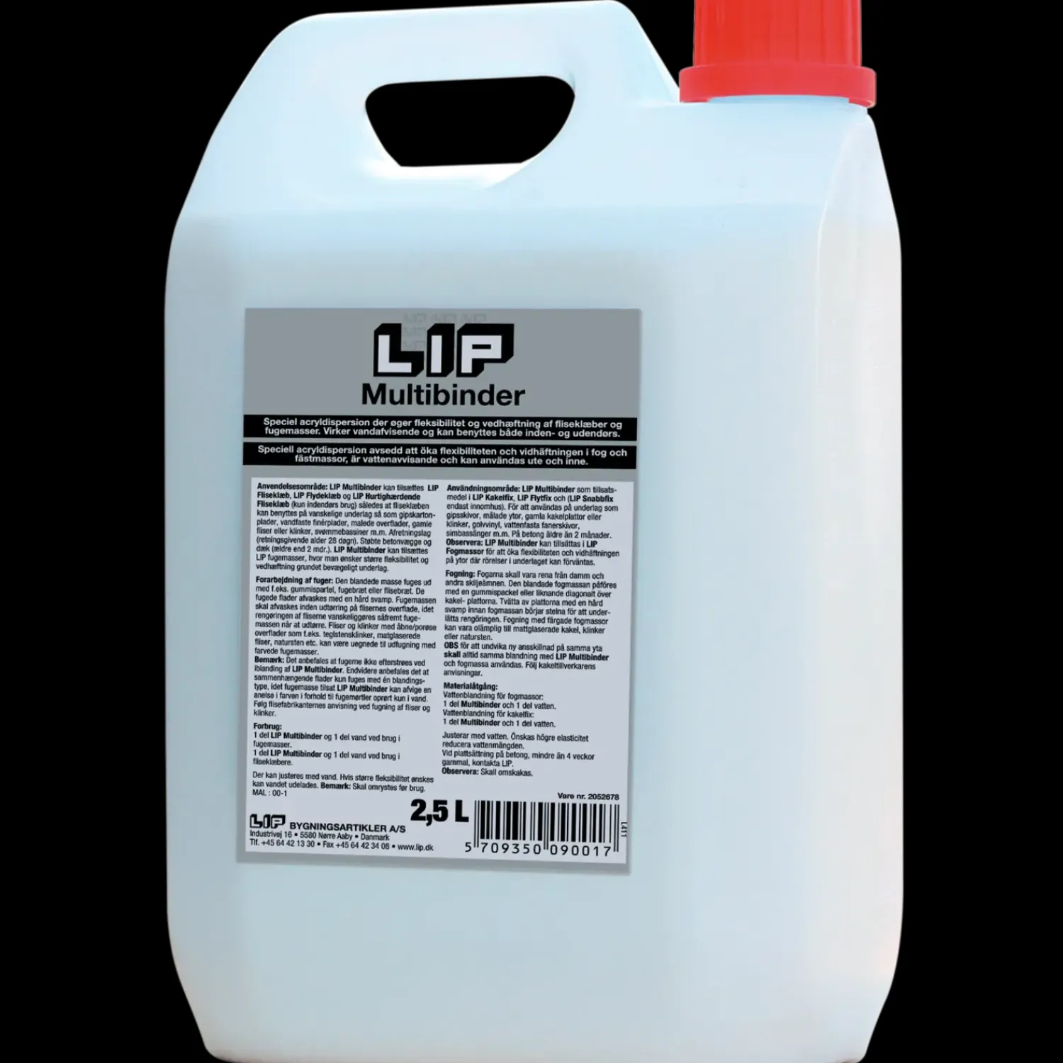 LIP-multibinder er speciel polymerdispersion, der øger fleksibilitet og vedhæftning. Multibinderen anvendes til fliseklæbere, fugemasser og spartelmasser. Ved anvendelse af produktet bliver fliseklæbere, fugemasser og spartelmasser vand- og smudsafvisende.