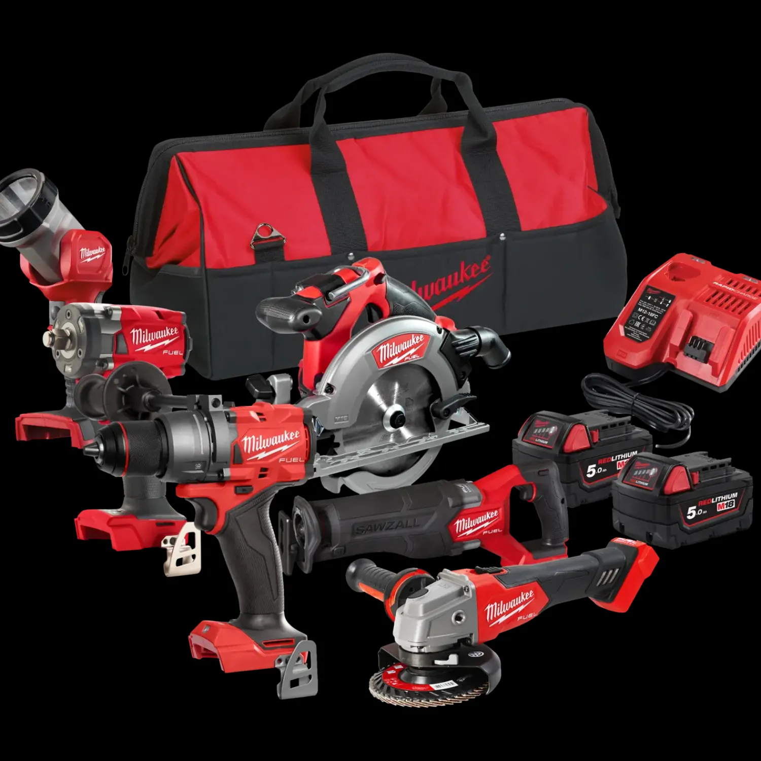 Sættet indeholder slagboremaskine, kompakt slagnøgle, rundsav, bajonetsav, vinkelsliber, arbejdslampe, hurtiglader og 2x batterier – Alt dette kommer i en samlet taske fra Milwaukee
