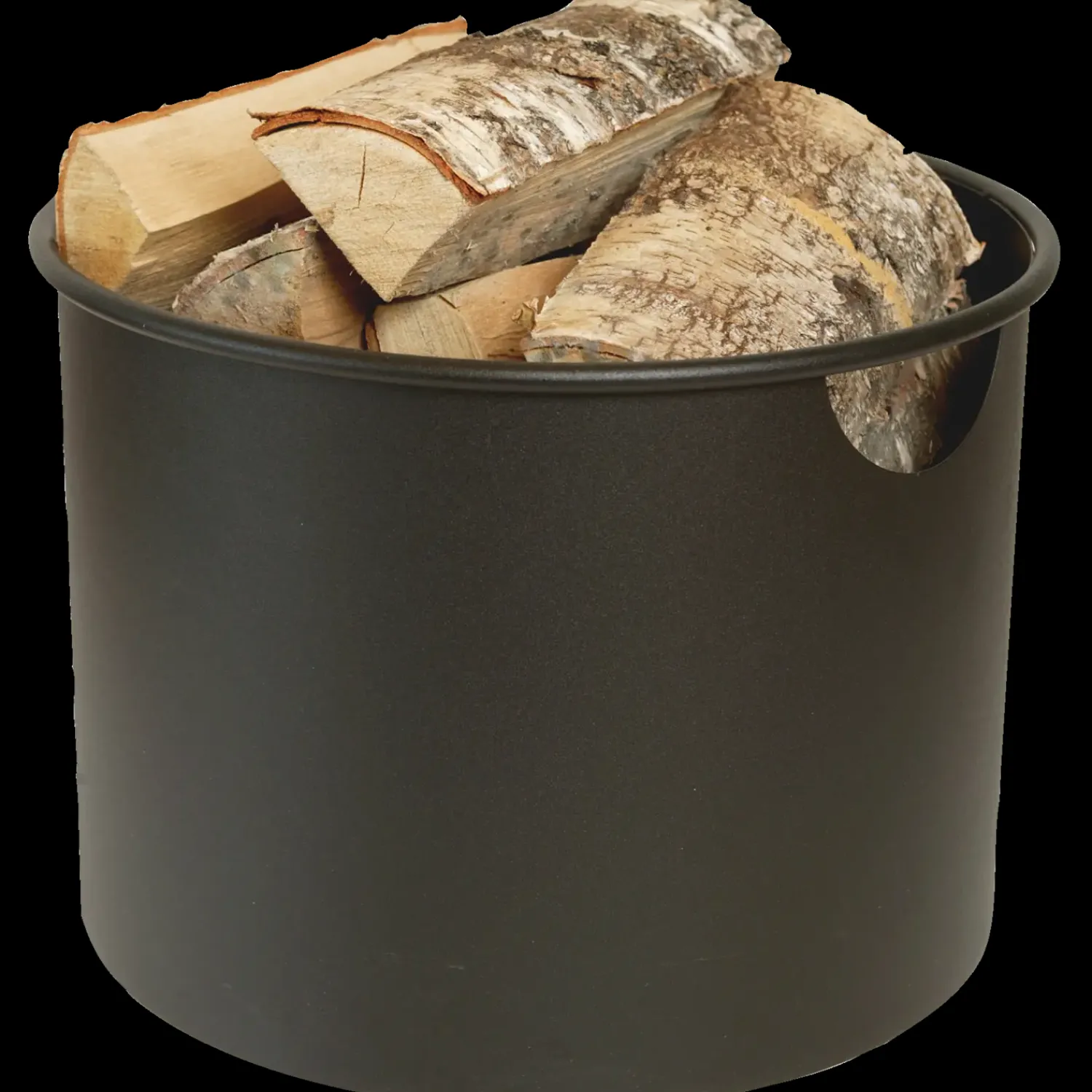Rund brændespand i enkelt design, der er lakeret med matsort strukturlak, med et lille Morsø logo præget på siden.