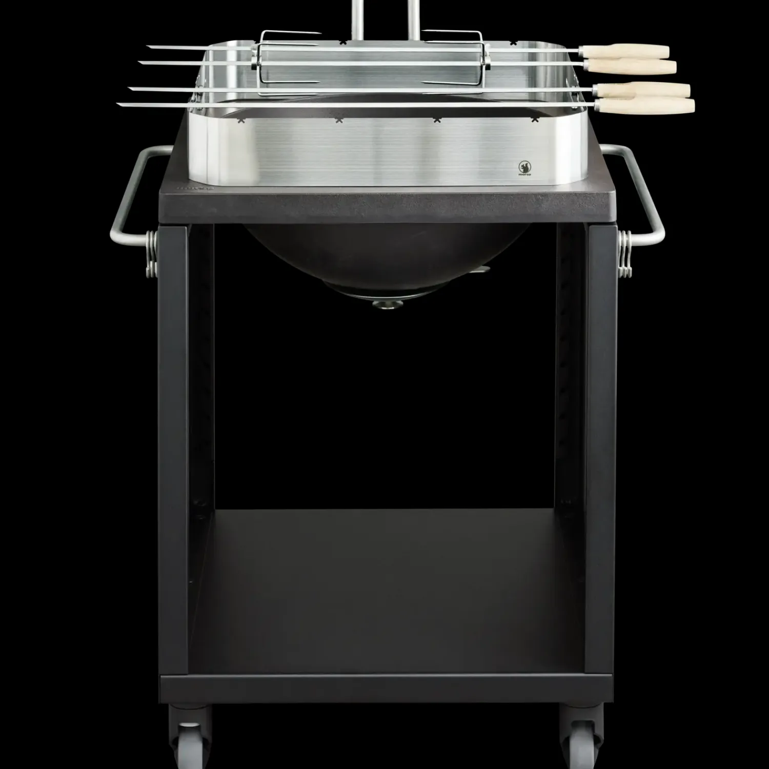 Med Morsø Churrasco kan du nu nemt tilberede kød, fisk og grøntsager på spyd. Produktet består af en indstillelig ramme, 4 spyd og 2 gafler. Materialet er rustfrit stål, som tåler anvendelse med høje temperaturudsving. Spydene har desuden ergonomisk behagelige greb udformet i olieret egetræ.