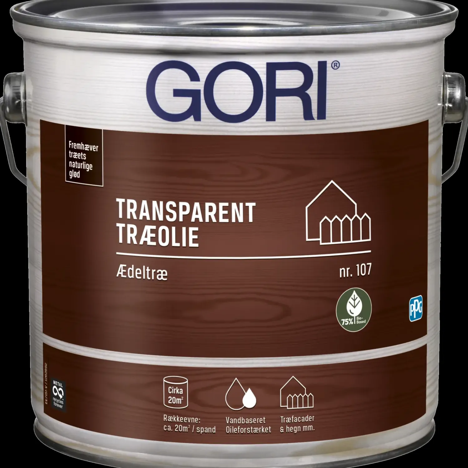 GORI 107 transparent træolie er en ædeltræ olie der er velegnet til vinduer, døre og facader af eksotiske træsorter som bl.a. mahogni og teaktræ. Olien beskytter træet mod vejret og beskytter overfladen mod skimmel. Inden påføring skal træet være rent og tørt.