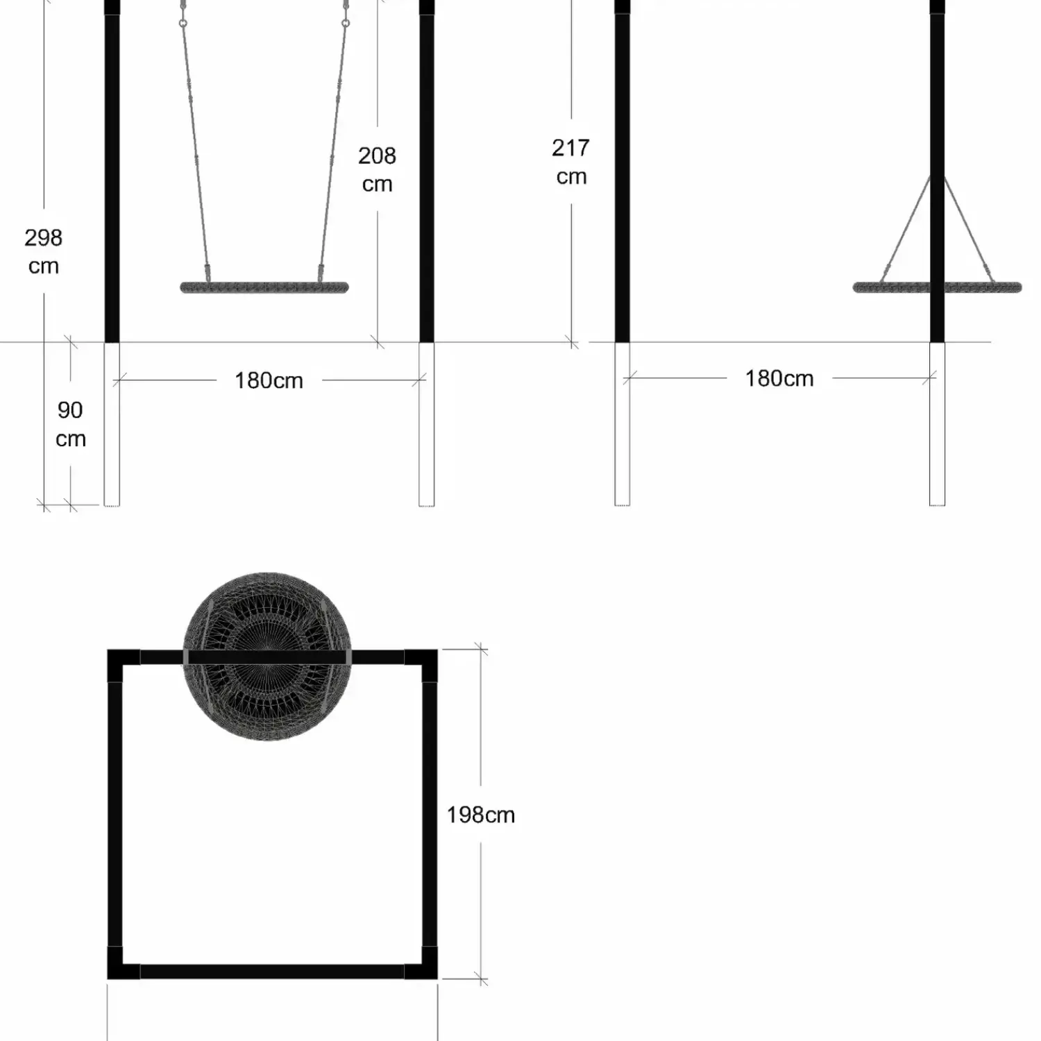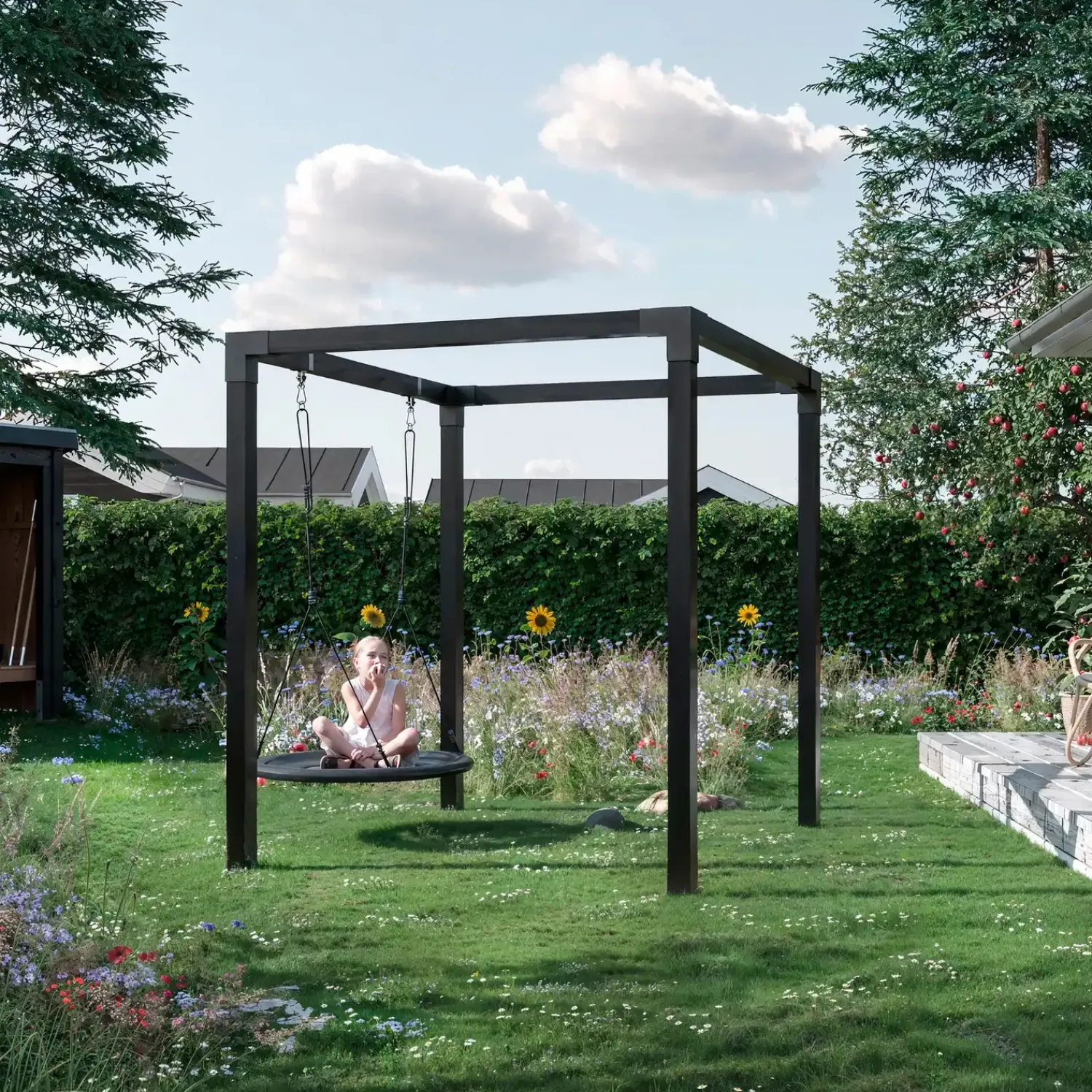 Daylife gyngestativ – model 1 – 179086-15Gyngestativ med redegynge, som nemt kan tilpasses, når børnene bliver for store til at bruge gyngen – stativet kan f.eks. bruges som tørrestativ eller pergola.Daylife serien er designet som en hyldest til dagligdagen og livet med alt, hvad det indebærer. Med Daylife er det nemlig nemt at skabe et skønt uderum, som kan bruges til hverdagens mange gøremål gennem hele livet og tilpasses i takt med livets behov ændres.Daylife leveres i overskuelige samlesæt, så det er nemt og hurtigt for dig at bygge dit nye uderum.Varenr. består af:Redegynge, gyngeophæng, Cubic beslag og stolper til nedgravning. Inkl. skruer.Redegynge:Ø98 cm.Sort – vandafvisende stof med PE mesh.Flettet reb med sorte PP svejsninger.Belastning pr. sæde = 150 kg.Inkl. 2 stk. gyngeophæng.Beslag:Cubic Hjørnebeslag Dobbelt 20×20×20 cm (4 stk.).Galvaniseret og pulverlakeret sort.Sort RAL 9005.Stolper:Omlimede træstolper 9×9 cm til nedgravning.Trykimprægneret (NTR mærket klasse A) og grundmalet sort.Nærmeste RAL 9005 – vandbaseret.Trykimprægneret NTR mærket klasse A – betyder, at de er effektivt beskyttet mod råd og tåler nedgravning. Stolperne er sammenlimet (omlimet) af to stykker træ for at mindske revnedannelser og vridning samt sikre styrke og formstabilitet.Leveres som ‘Saml selv’.PLUS legereskaber er CE mærket – godkendt til privat brug.