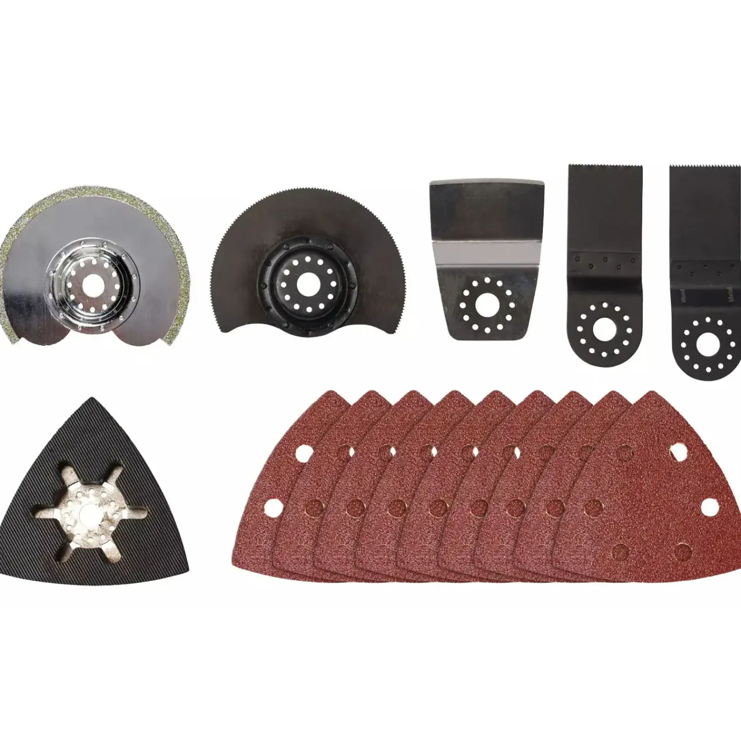 Produktet leveres med en delta slibe-/slibeplade, 9 ark slibepapir 3 x K60 3 x K80 og 3 x K120, skraber, dykskåret klinge til træ og plast (HCS) og et til metal (BIM), en savklinge til træ, plast og blødt metal (HSS) og en diamantklinge til flisefuger.