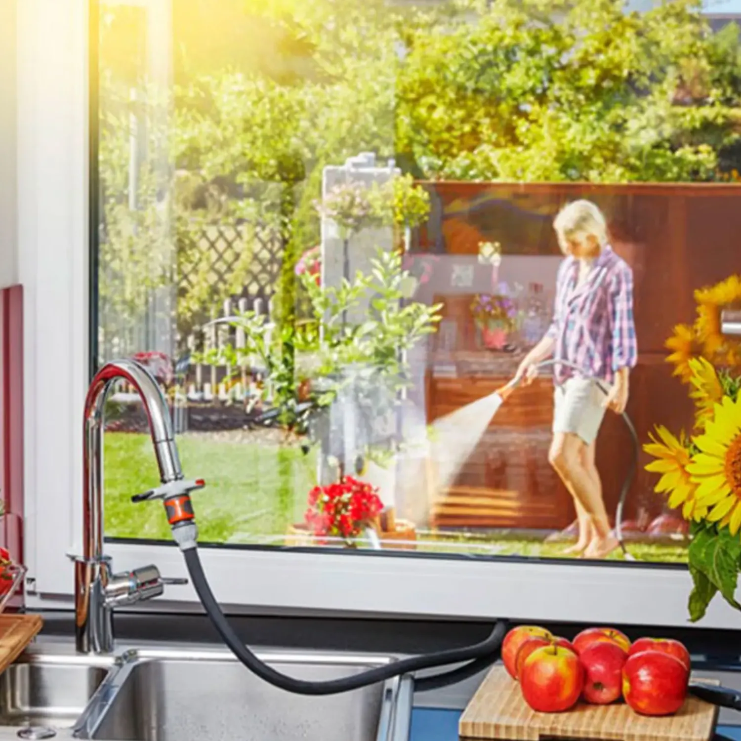 Har du ikke en udendørs vandhane? Så fortvivl ikke, med denne adapter fra Gardena kan du spare de mange ture med vandkanden for at fylde den indendøre.