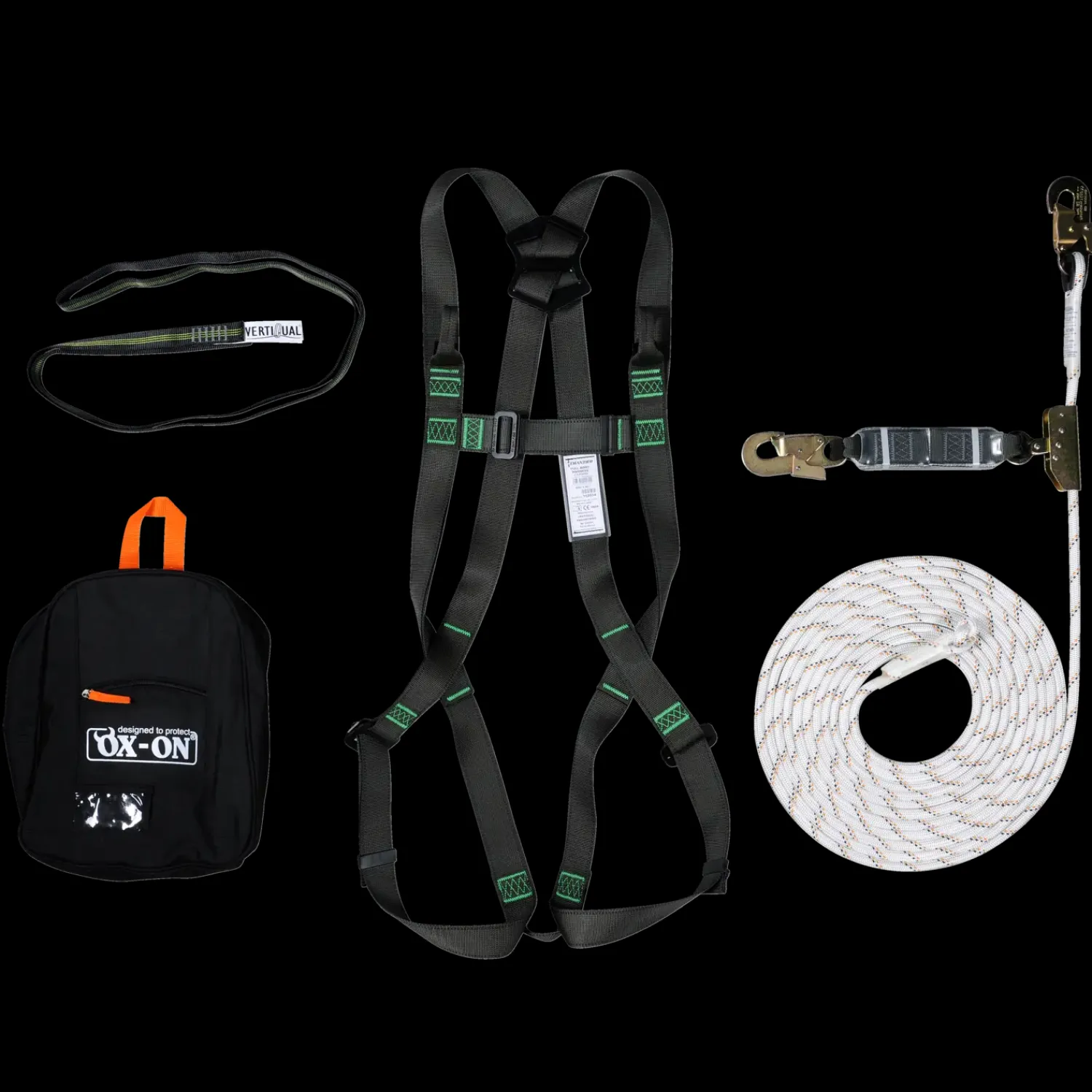 OX-ON Fall Protection Kit Basic er et økonomisk attraktivt standard faldsikringssæt, der er velegnet til stillads-, facade- eller tagarbejde.