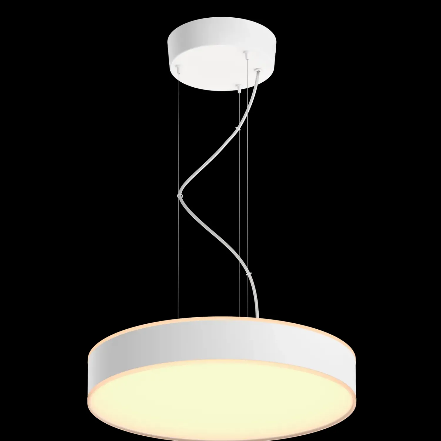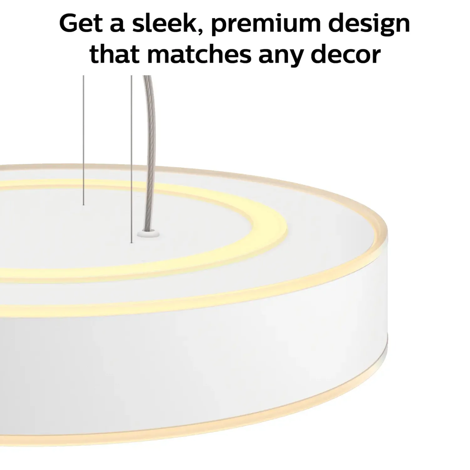 En familie af intelligente lamper i et moderne design og med en meget bred lysvinkel. Denne Enrave pendel i hvid giver både et blødt opadgående lysskær samtidig med at den nemt oplyser et stort rum med sit kraftige, nedadgående lys – perfekt til spisestuen og køkken-alrum. Med White ambiance får du mulighed for at tilpasse din belysning efter behov og sætte den helt rette atmosfære. Skift mellem kolde og varme toner af hvidt lys, og vælg mellem fire forudindstillede lysscener for at skabe den perfekte stemning til alle rutiner og anledninger i dit hjem.