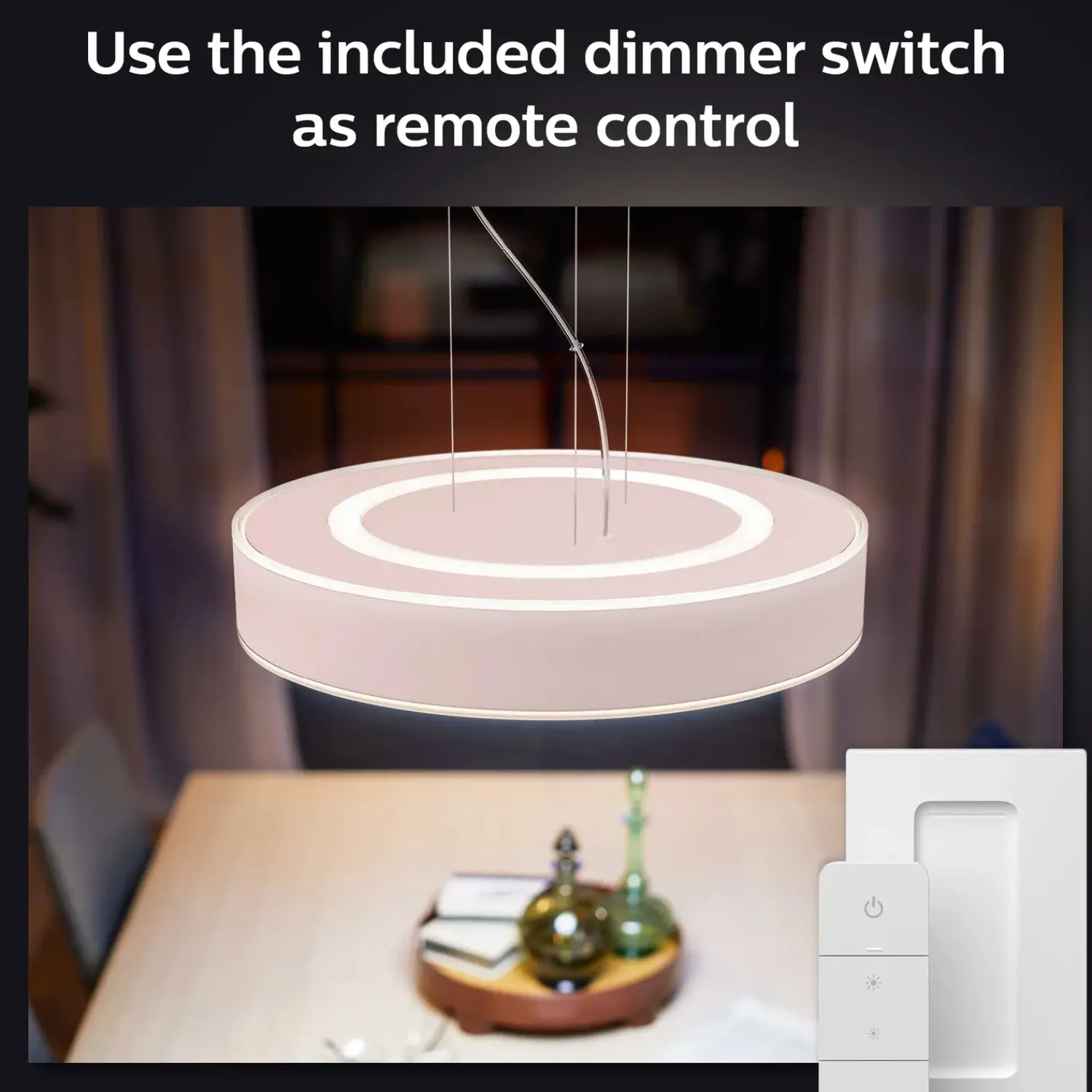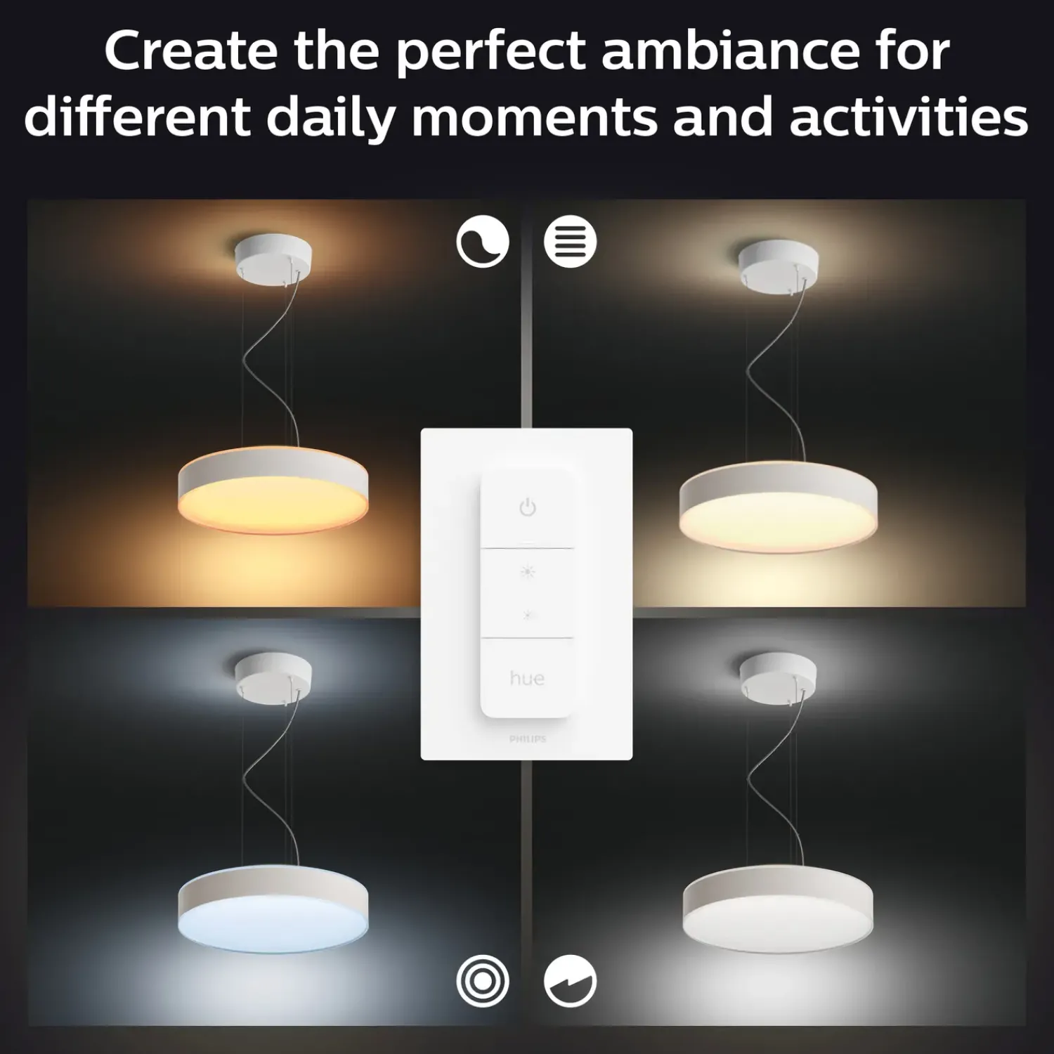 - Få øjeblikkelig kontrol over din intelligente belysning fra Philips Hue med en Hue dimmer switch. Med ét tryk på en knap kan du styre lyset i hele dit hus. Dæmp eller oplys rummene, tænd og sluk for lyset eller skift mellem belysningsscener