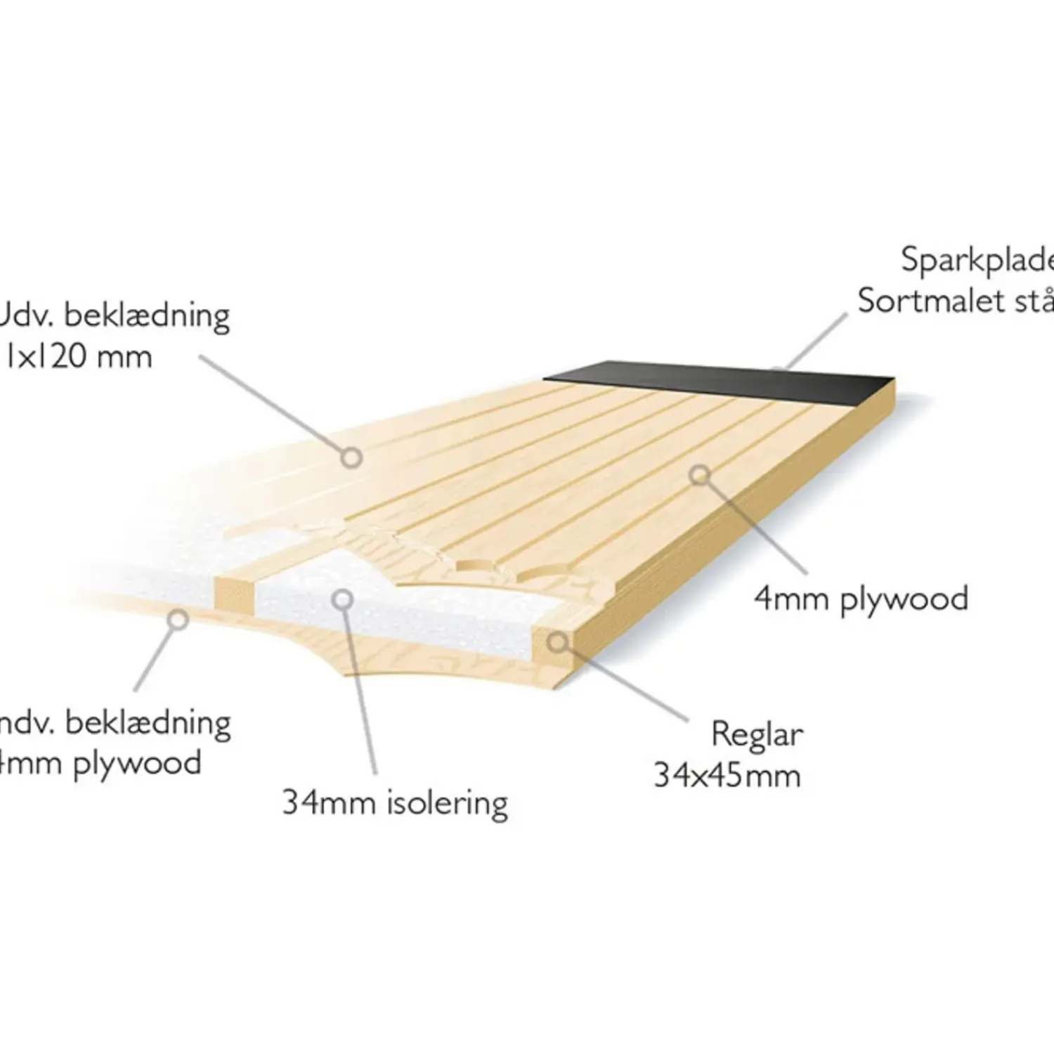 - Pakken består af 1x dør inkl. karm og låsekasse. Ekskl. greb, cylinder, karmskruer og tætningslister