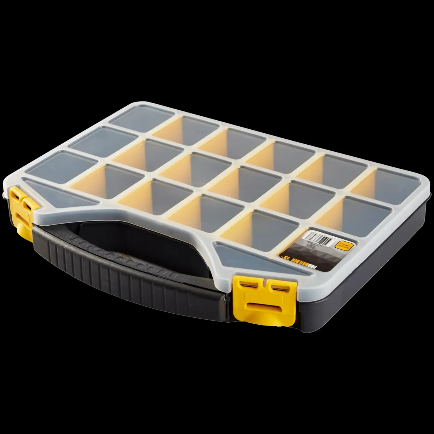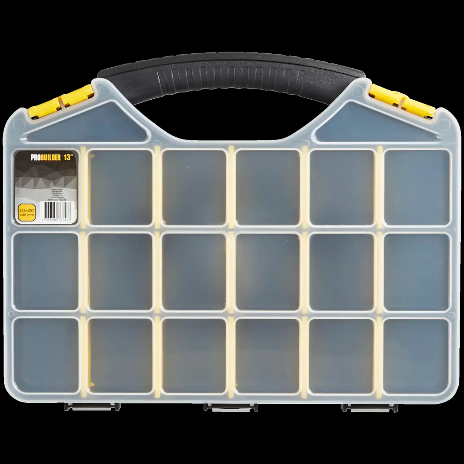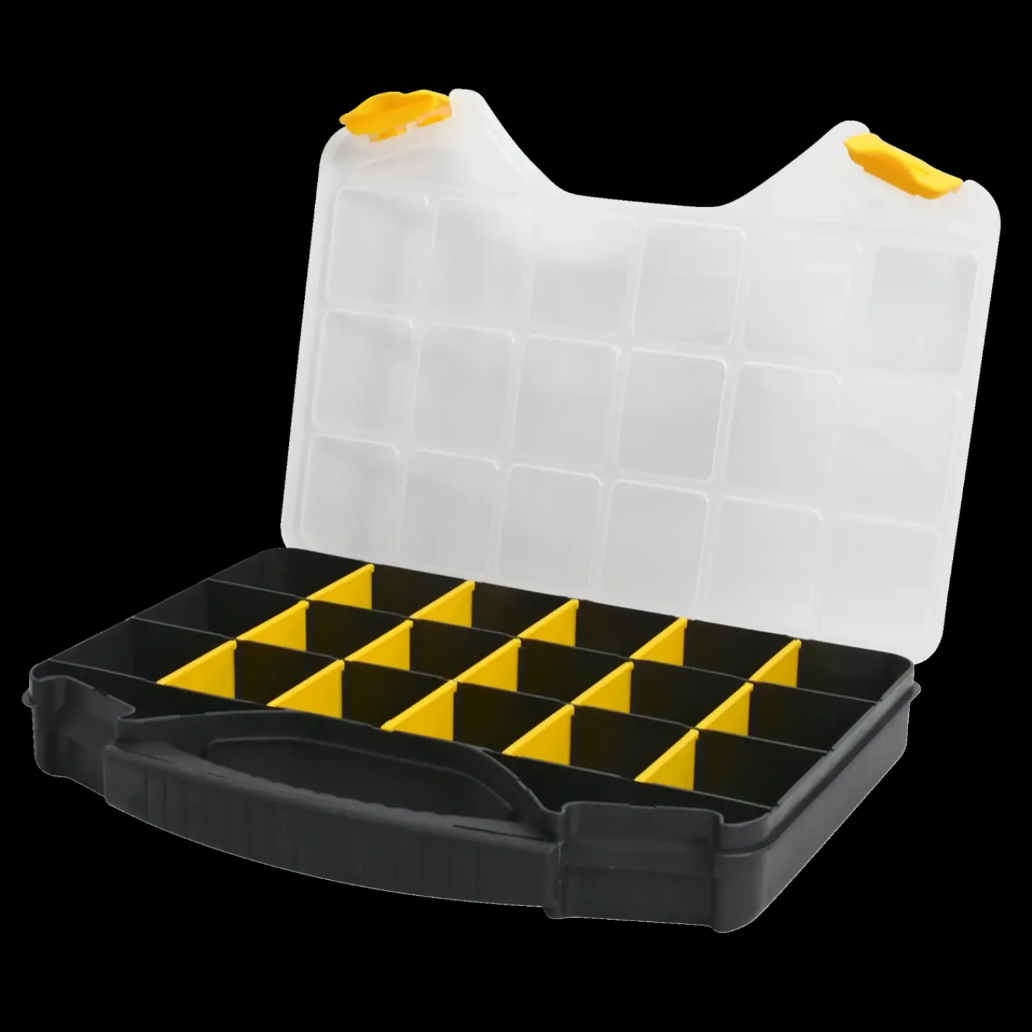 Sortimentsæske til f.eks. værktøjsopbevaring, tilbehør, skruer eller perler. Udstyret med lukkebeslag og transparent låg.