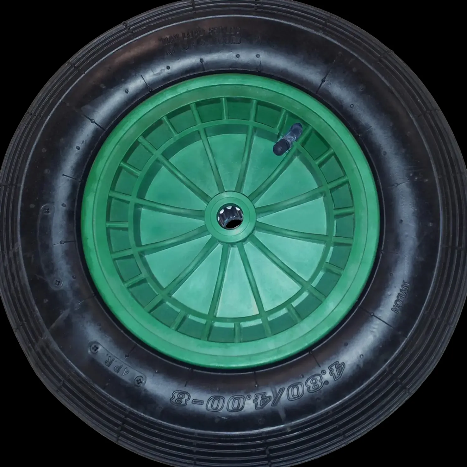 Luftgummi hjul 4.00 x 8. Nav: 20 x 85 mm. Grøn plastfælg med rulleleje.