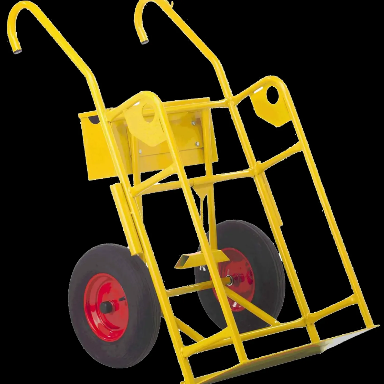 Ilt- og Gasvogn til 2 store flasker. Vognen er udstyret med løftebeslag, der letter tilbage tipningen ved igangsættelsen, de store bløde luftgummihjul søger for stødabsorbering og giver dermed en behagelig og jævn kørsel med vognen. Mellem håndtagene er der monteret en stålkasse, så der her er en hurtig og nem opbevaring af spændnøgler og andet udstyr.