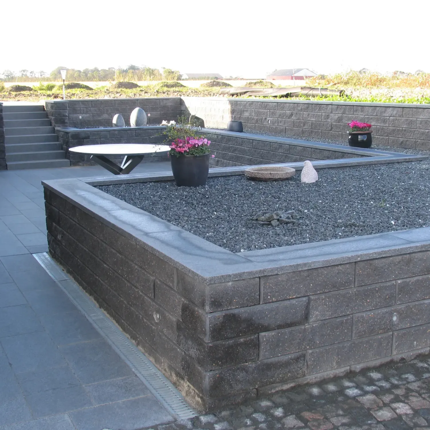 Grundstenen i BB-mur systemet til enkel og sikker opbygning af læ- og støttemure i din have og din indkørsel. Stenen er brudet på begge sider, hvilket gør den perfekt til skillemure.