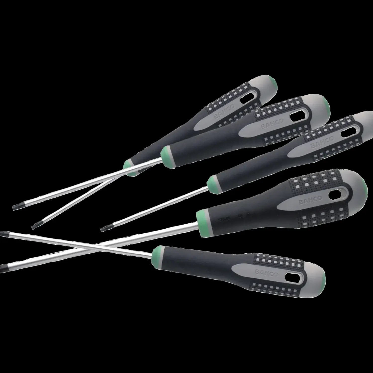Torx skruetrækkersæt i Bahco’s ERGO serie med 3 -komponent håndtag i blødt nubret materiale. Overfladen giver et godt greb og højere vridmoment.