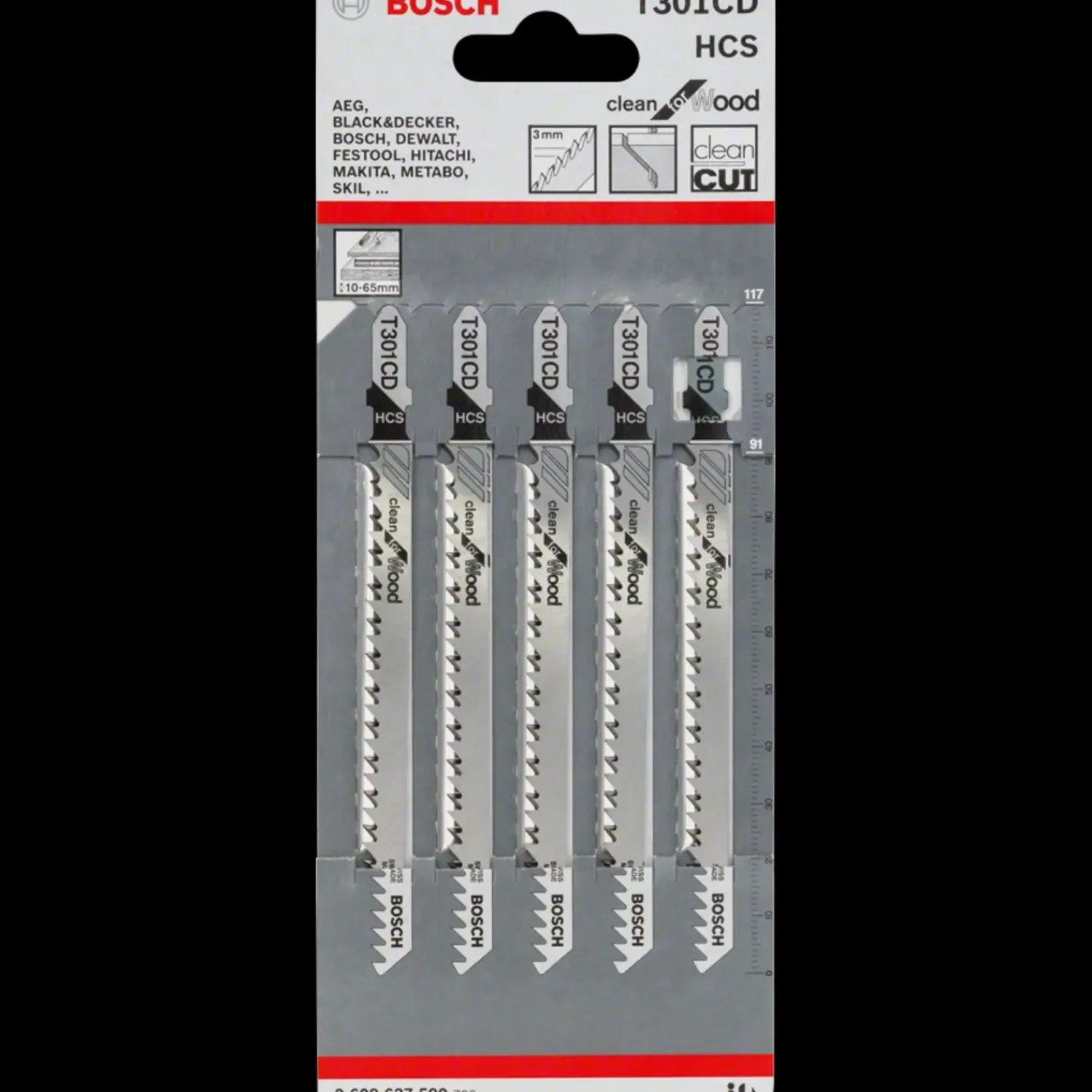 Stiksavklinge T 301 CDRene snit i blødt træ – T 301 CD Clean for Wood stiksavklingen giver rene, lige snit i træ. Dens præcisionsfrivinkelslebne tænder med tandslebet konstruktion giver rene resultater. Bladet er fremstillet af kulstofrigt stål og egnet til savning i blødt træ og ikke-abrasive træbearbejdningsmaterialer. Den er udstyret med en mellemstor tandhøjde (3 mm) og lang klinge (117 mm) til savning i træmaterialer med en tykkelse på 10-65 mm. Til brug sammen stiksave med fastgørelsessystemer med T-skaft. Passer til alle stiksave med T-holderRene snit i blødt træ, ikke-abrasive træbearbejdningsmaterialerPræcisionsfrivinkelslebne tænder med tandslebet konstruktion giver et rent resultatHCS-materiale (kulstofrigt stål) er egnet til savning i blødt træ og ikke-abrasive træbearbejdningsmaterialerMellemstor tandhøjde (3 mm) og lang klinge (117 mm) saver træmaterialer med en tykkelse på 10-65 mmMateriale: HCSTandudførelse: Frivinkel- og tandslebetSamlet længde [mm]: 117Tanddeling [mm]: 3,0Anvendelsesområder: Blødt træ, spån-, møbel-, fiberplader (10-65 mm)Anbefalet min. materialetykkelse [mm]: 10Anbefalet max. materialetykkelse [mm]: 65Type: T 301 CD
