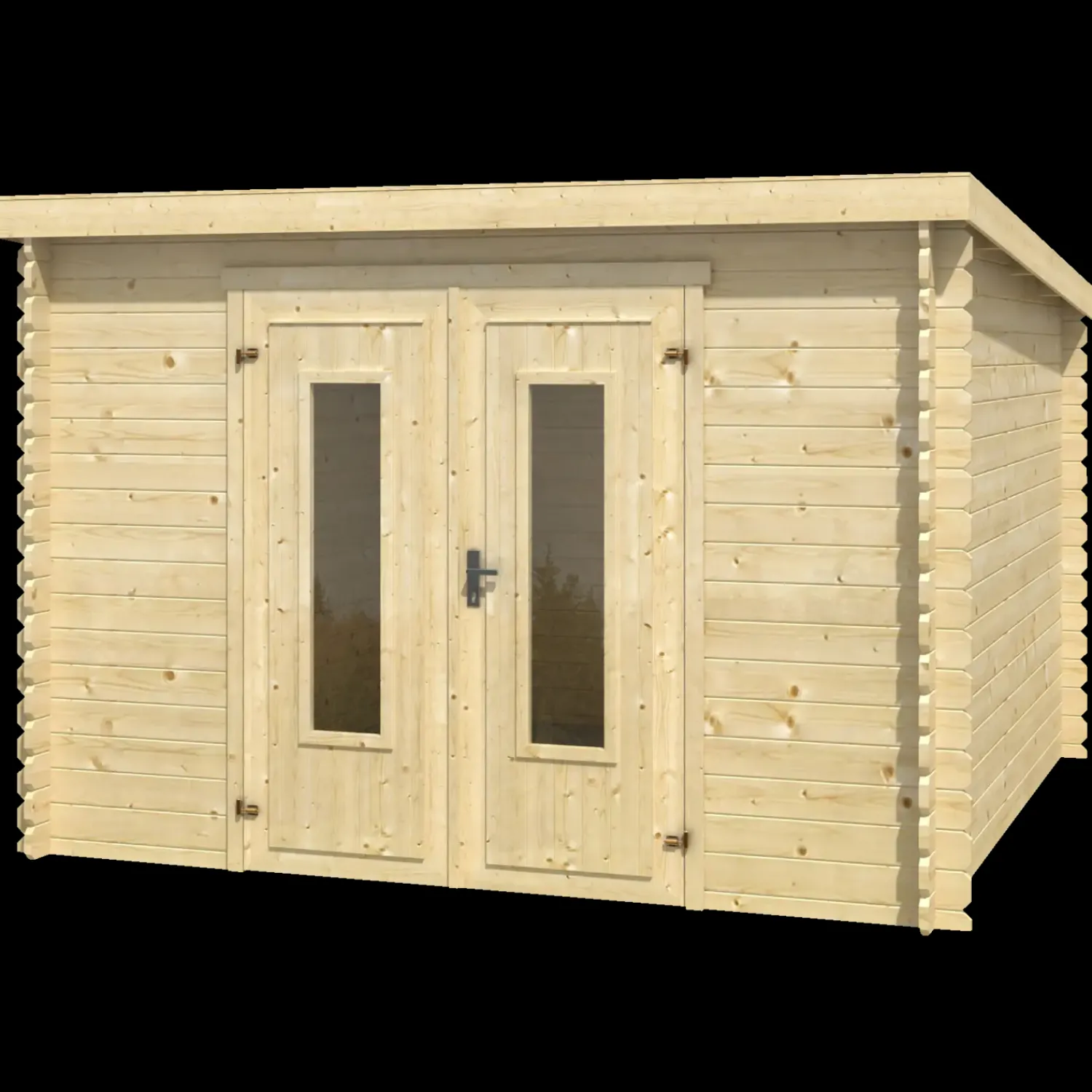 Hytten er fremstillet af 28 mm bjælker i 100 % naturligt og levende træ, der ikke er behandlet. Du vil derfor kunne opleve at træet har forskellige toner, hvilket sikrer dig en unik hytte hvor hver en detalje, tekstur og grenmønster er sin egen. Derudover er hytten fremstillet med stor dobbeltdør med glas hvilket giver et fint lysindfald. Hyttens højeste udvendige punkt: 2,11 m.