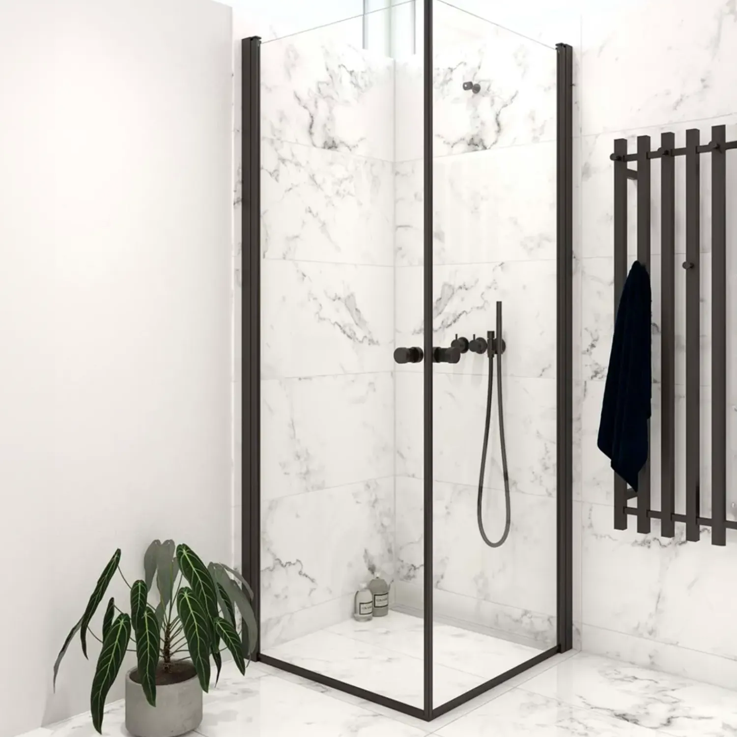 Brusedøren er med 6 mm hærdet sikkerhedsglas med EasyCarebehandling på indvendig side og stærk aluminiumslegering med slidstærk, mat sort overflade. Dørens hængsel er med hæve-sænkebeslag der løfter døren fri af gulv ved åbning og giver selvlukkemekanisme, hvor døren holdes åben ved 90 grader.